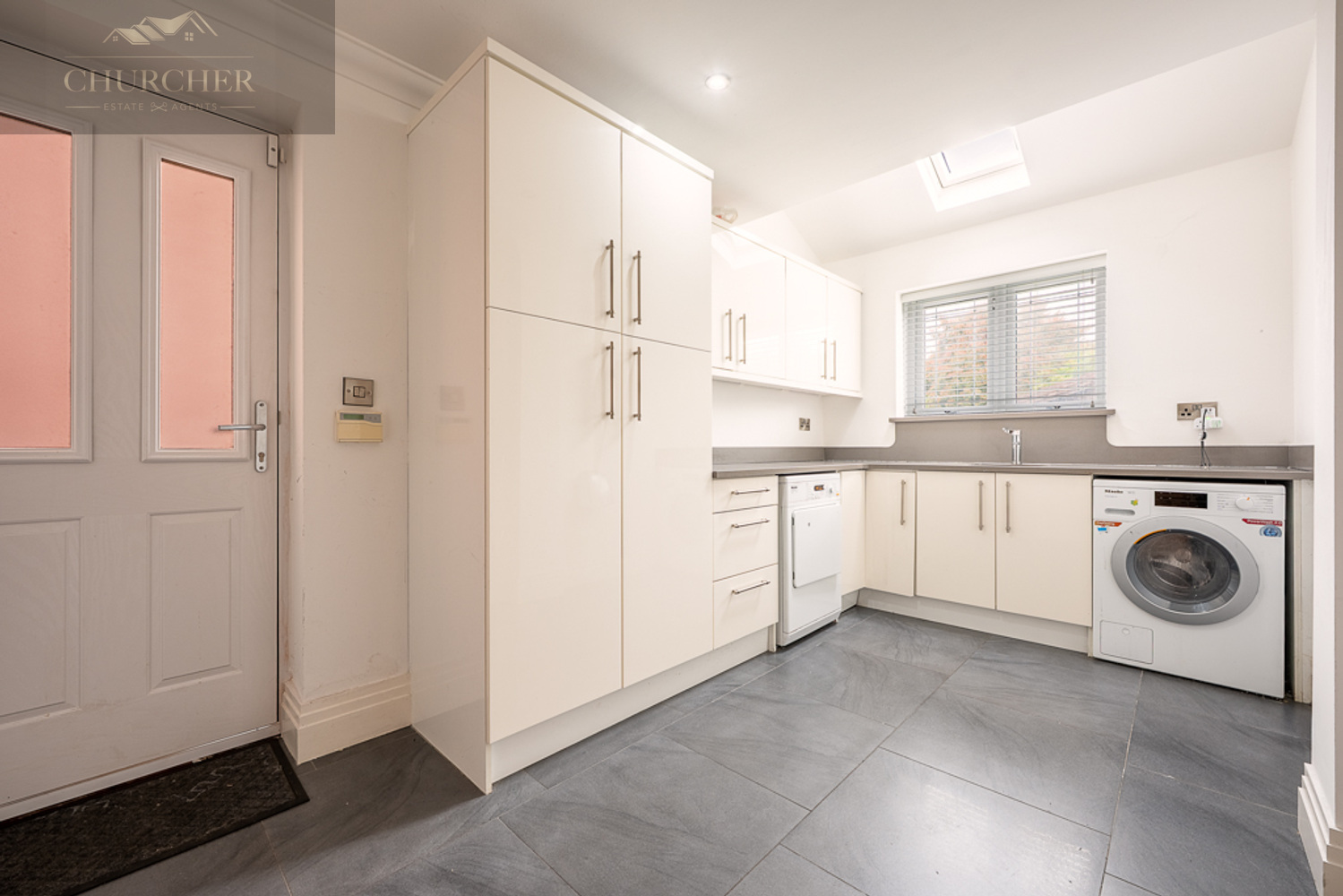 A separate utility room sits just off the kitchen, providing excellent additional storage and appliance space while keeping laundry and household tasks neatly tucked away. From the utility, there is access to a modern ground-floor WC, fitted with contemporary fixtures and complementing the home’s sleek style, as well as a door leading out to the garden for added practicality.