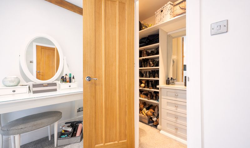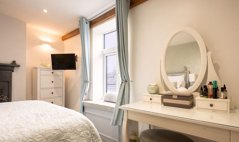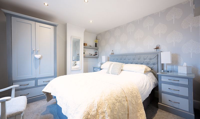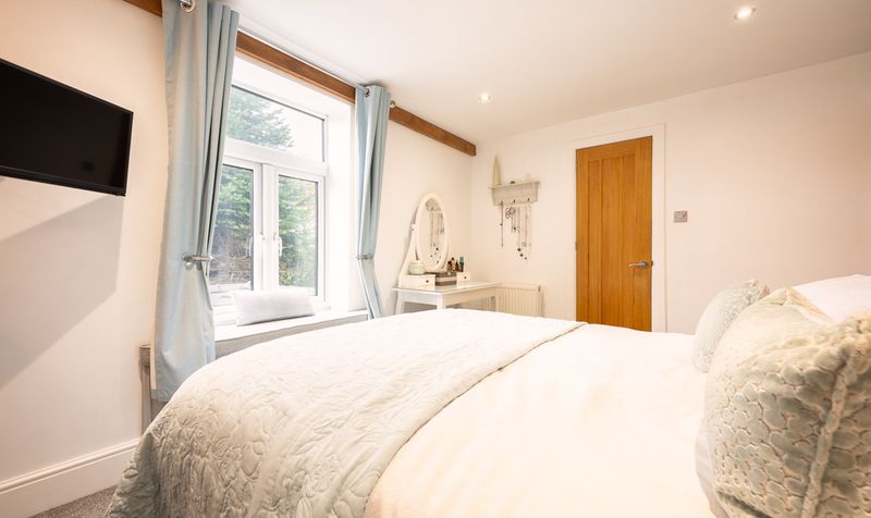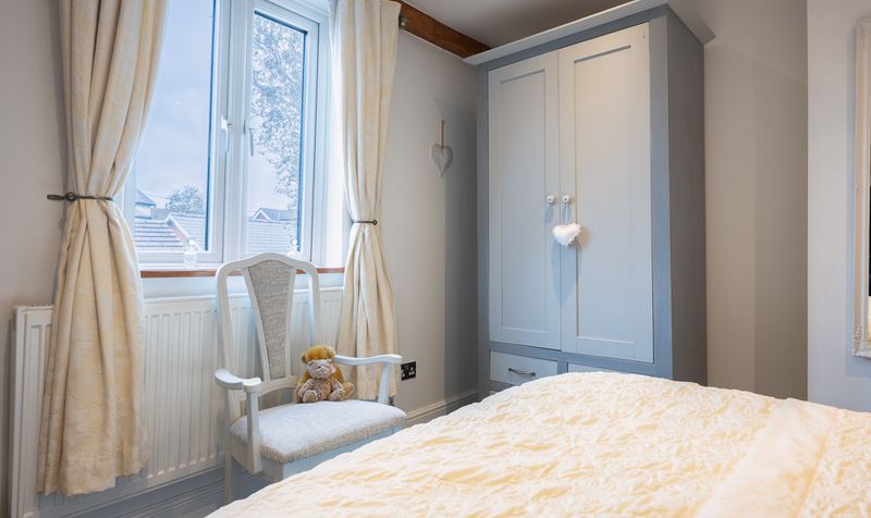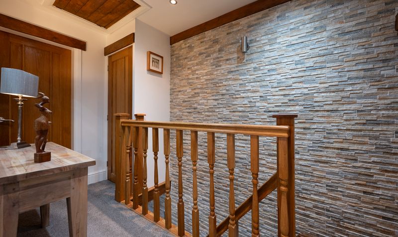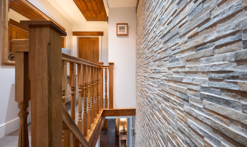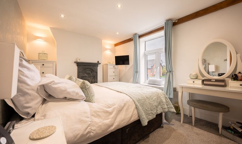 Upstairs, the landing impresses with feature stone-effect walls, oak detailing, and soft lighting, offering a wonderful sense of warmth and character. The main bedroom is a calm and restful retreat, boasting elegant décor, a decorative cast-iron fireplace, and a bespoke walk-in dressing room that provides exceptional storage. This room has been thoughtfully designed to combine both style and practicality, offering a true sense of sanctuary. The second bedroom is equally spacious, featuring a large window that fills the room with natural light, complemented by bespoke fitted wardrobes and neutral décor that creates a bright and airy feel.