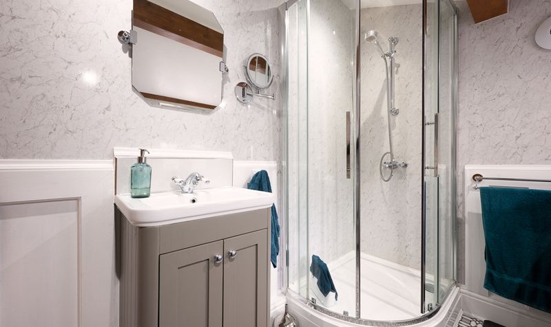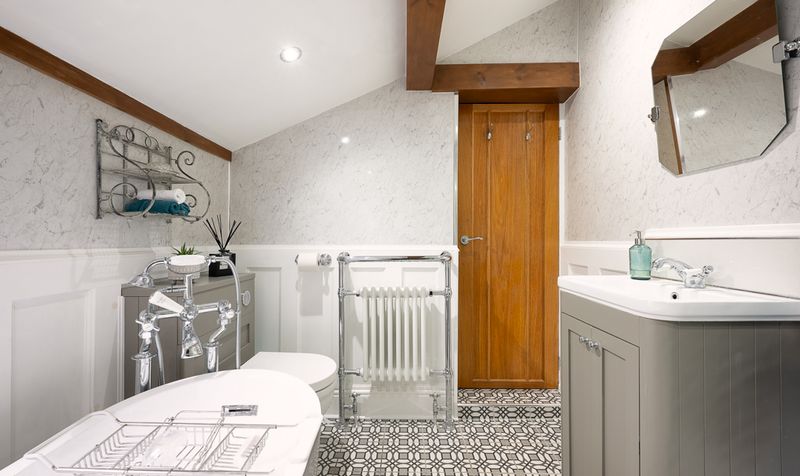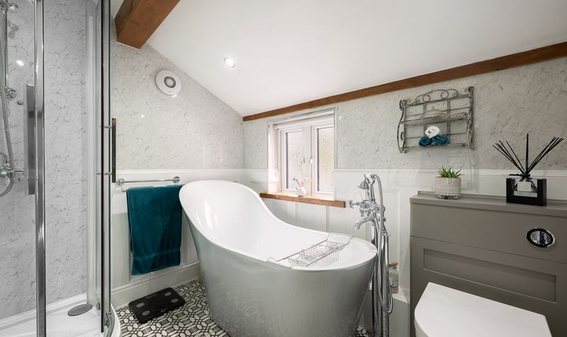 The family bathroom is a real showpiece – spacious, stylish, and finished to the highest standard. A freestanding roll-top bath takes centre stage, complemented by a separate walk-in shower, a contemporary vanity unit, and designer tiling throughout. With sleek chrome fittings, a feature beam, and soft ambient lighting, this room offers a perfect space to unwind in complete comfort and luxury.