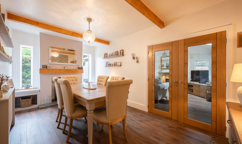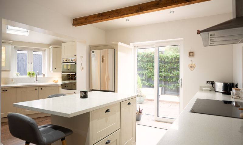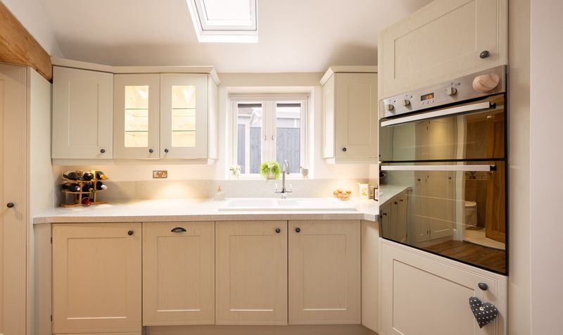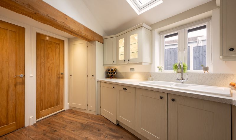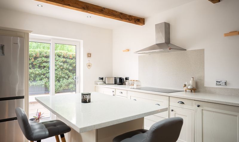 The kitchen is a true highlight of the home. Designed with a seamless blend of rustic charm and modern practicality, it features shaker-style cabinetry, quartz worktops, integrated appliances, and a central breakfast island with seating. Exposed ceiling beams and French doors lead directly onto the courtyard, allowing for effortless indoor-outdoor living and dining.