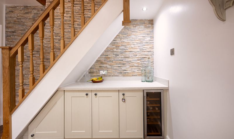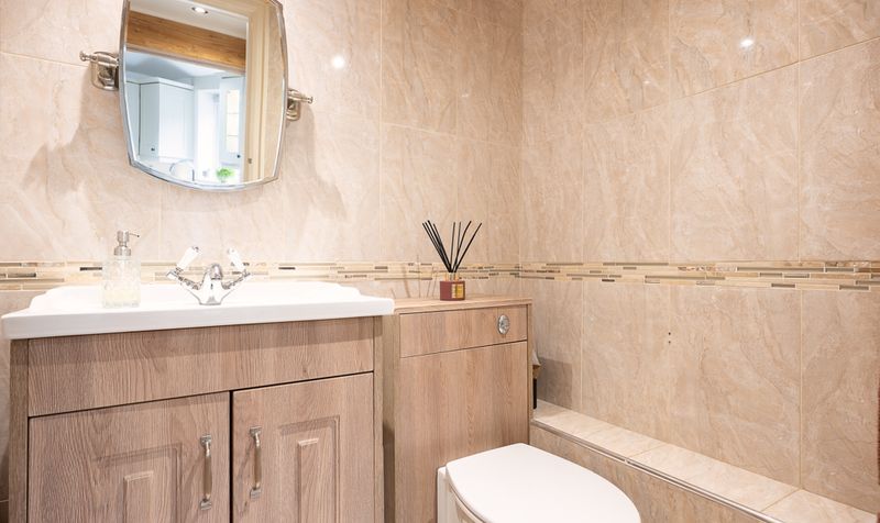 Tucked neatly under the stairs, a bespoke built-in bar area with quartz counter, fitted cabinetry, and a wine cooler adds a touch of refinement – perfect for entertaining. A beautifully tiled ground floor WC with vanity unit and chrome fixtures completes this part of the home.