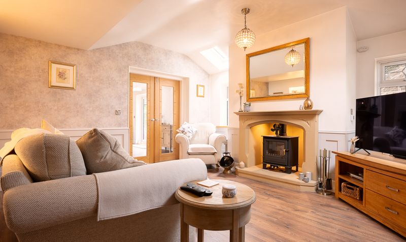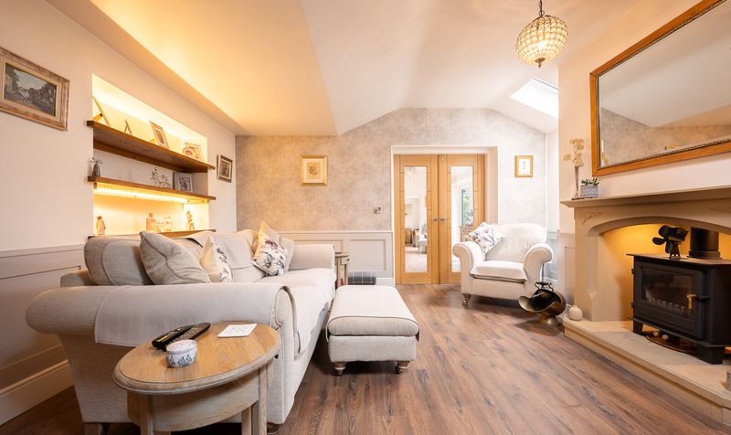 To the right, the main lounge offers a peaceful retreat, featuring a striking fireplace with wood-burning stove, panelling, and two large skylight that floods the room with natural light. The décor is sophisticated yet cosy, with layered lighting and soft textures creating an inviting ambiance. Double glass doors open into the formal dining room, a beautiful space with exposed beams and twin feature windows – ideal for entertaining family and friends in style.