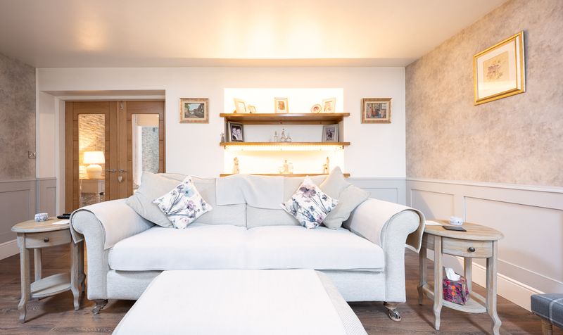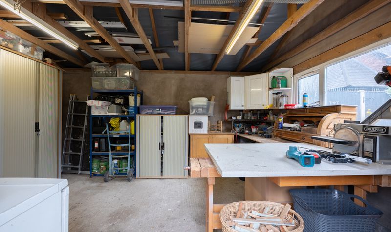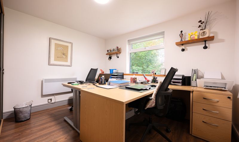 A second lounge or guest bedroom sits just off the entrance hall, offering a flexible space ideal for relaxing, a playroom, or a quiet reading nook. Beyond this, a well-appointed home office provides a professional and peaceful workspace, while the adjoining store room leads to a fully equipped workshop – perfect for DIY projects, hobbies, or conversion potential.