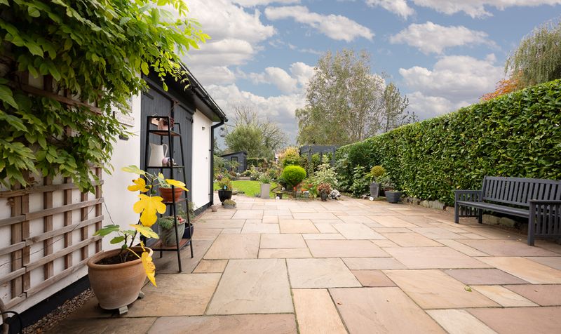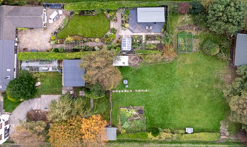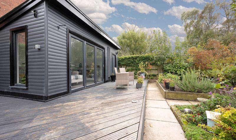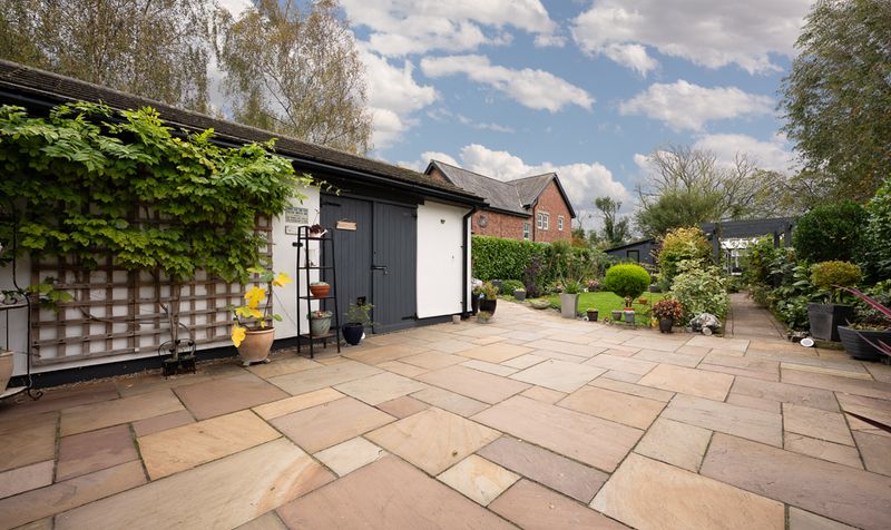 Outside, the property truly excels. To the rear, a beautifully landscaped south-facing garden unfolds into multiple zones designed for both relaxation and recreation. A generous stone-paved terrace provides the perfect setting for outdoor dining and entertaining, while manicured lawns, mature borders, and colourful planting add vibrancy and depth throughout the seasons. The garden continues to a further section featuring a timber summer house, greenhouse, and vegetable garden – ideal for those who love gardening or simply want to enjoy the tranquillity of nature.