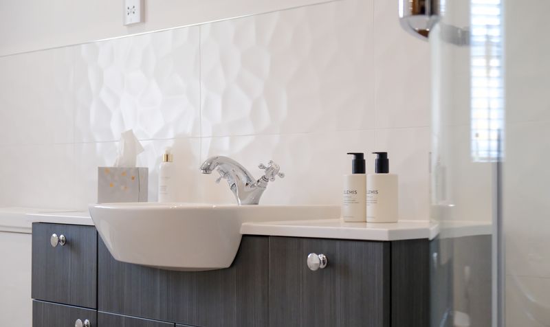 The main family bathroom is a standout feature of the home, offering a truly luxurious space for both relaxation and everyday convenience. Thoughtfully designed with a soft, contemporary aesthetic, the bathroom is beautifully appointed with a corner bathtub-perfect for unwinding after a long day-alongside a separate walk-in shower with curved glass enclosure and rainfall showerhead. The vanity unit offers generous storage behind sleek high-gloss doors, topped with a modern countertop basin and stylish chrome mixer tap. A large mirror above enhances the sense of space and light, complemented by chic herringbone-effect flooring and soft white textured wall tiles. Natural light flows in through the rear window, and the overall design blends calm, comfort, and modern sophistication effortlessly.