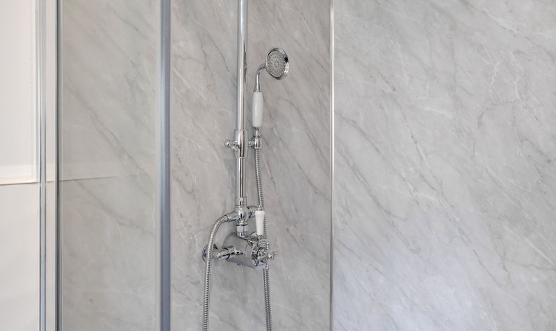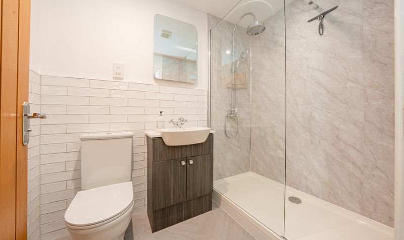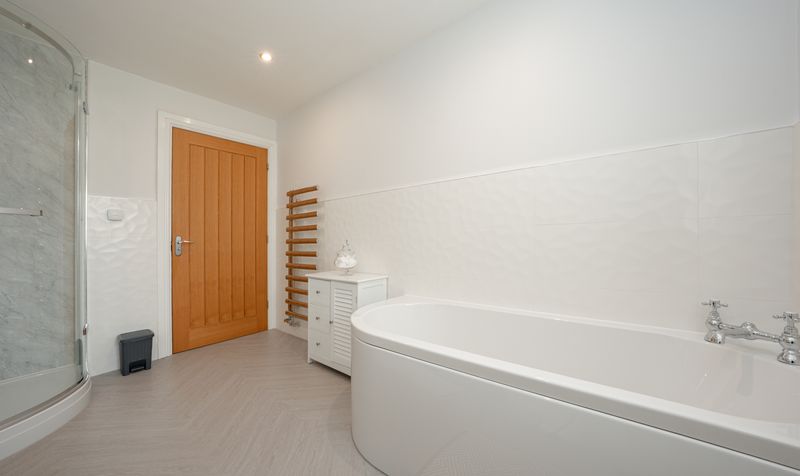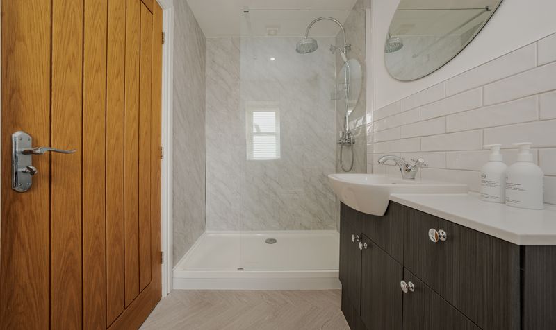The en-suite bathroom is finished to an exceptional standard, showcasing a large walk-in rainfall shower with full-height marble-effect tiling and a sleek frameless glass screen. A wide vanity unit with high-gloss cabinetry and a stylish countertop basin provides ample storage, while the contemporary chrome fittings and feature mirror add a polished, high-end finish. A heated towel rail and natural light from the frosted window complete the space, ensuring every detail has been carefully considered for both comfort and sophistication.