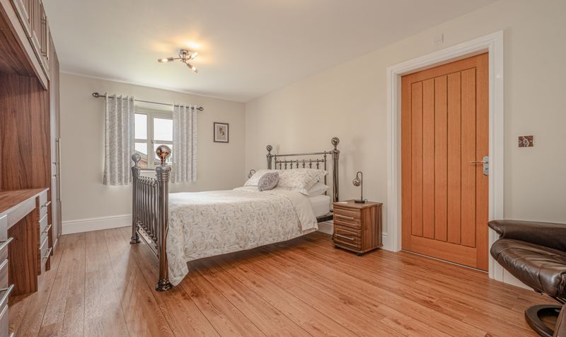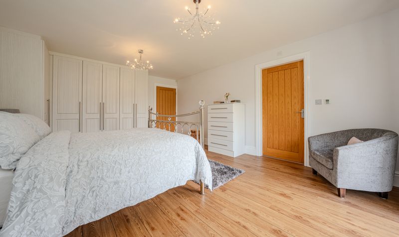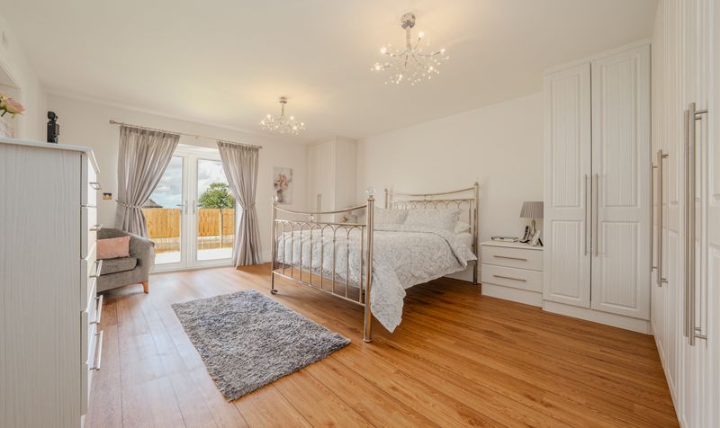 Moving through to the bedroom wing, four spacious and beautifully finished double bedrooms are positioned along a private corridor. The principal suite is a true sanctuary, combining luxury and tranquillity in perfect harmony. This spacious bedroom features a full wall of bespoke fitted wardrobes, elegant chandeliers, and soft neutral tones that create a peaceful, hotel-like ambiance. French doors open directly onto the garden, allowing you to step outside with your morning coffee and enjoy the serenity of the grounds.