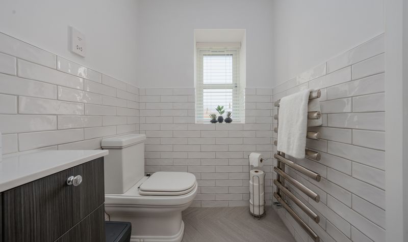 Two further bedrooms also benefit from built-in wardrobes; one being served by another sleek en-suite shower room with rainfall head and elegant tiled walls. The remaining bedrooms are all excellent sizes, each with a serene, neutral finish, and plenty of space for furnishings and storage.