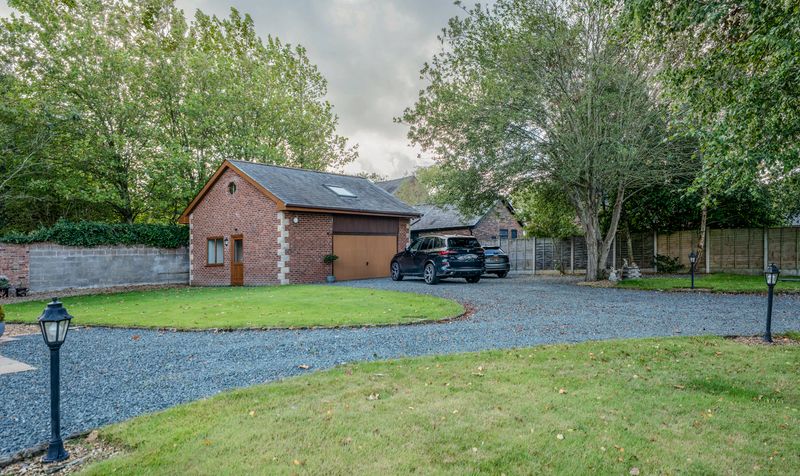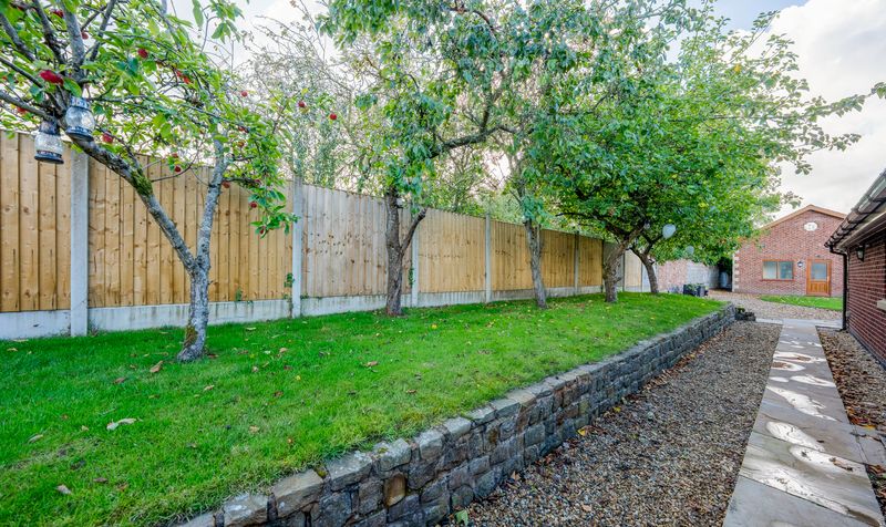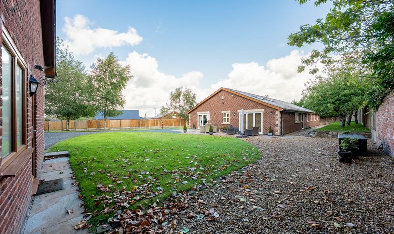 Externally, the gardens at Meadowcroft are just as impressive as the interiors – beautifully maintained and designed with both relaxation and family life in mind. A generous patio area wraps around the rear of the property, providing the perfect space for outdoor dining, entertaining guests, or simply enjoying the peaceful countryside surroundings. Beyond this, the expansive lawn stretches out towards the rear boundary, bordered by mature fencing and dotted with established trees and planting, offering privacy, colour, and a touch of natural charm throughout the seasons.