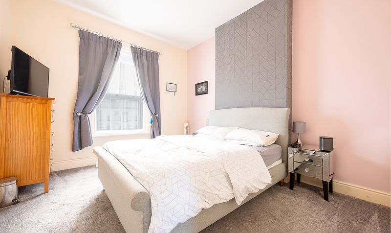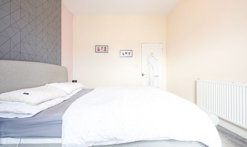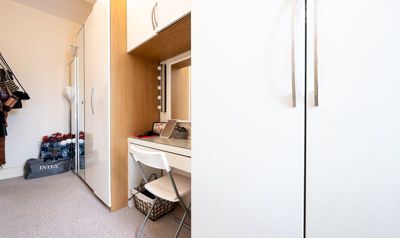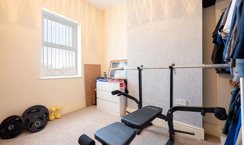 Upstairs, the property continues to impress with three well-proportioned bedrooms. The main bedroom is a spacious and calming retreat, beautifully styled with soft tones and offering ample space for freestanding storage and a dressing table, allowing buyers to tailor the room to their own needs. The second bedroom is currently utilised as a home gym and additional storage space, demonstrating its versatility while still offering comfortable proportions. The third bedroom is being used as a dressing room with further storage, again highlighting the flexibility of the accommodation to suit a range of lifestyles.