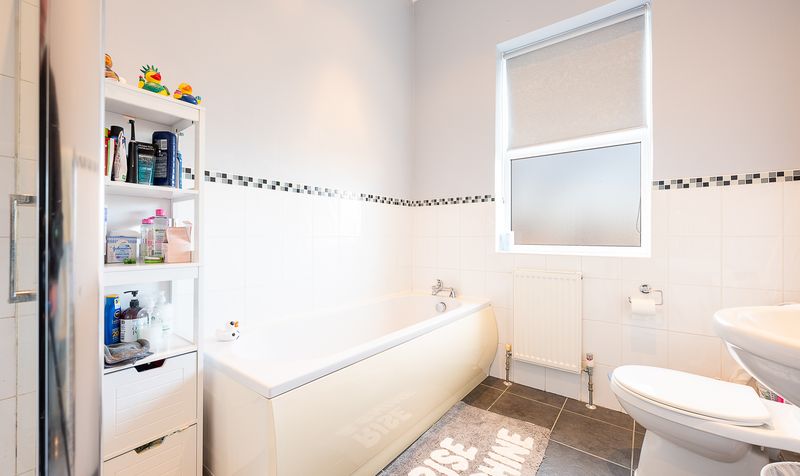The bathroom is finished to a clean and modern standard, featuring a bath, separate shower, wash basin, and WC, all complemented by neutral tiling and natural light from the window, creating a bright and functional space.