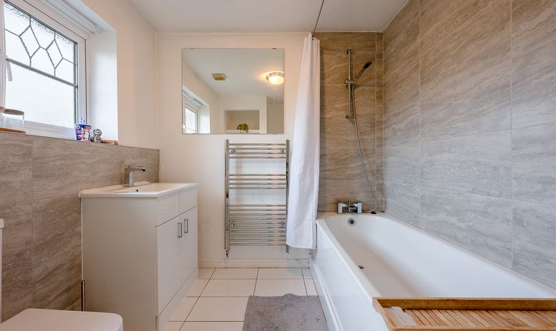 The family bathroom is finished in a clean and contemporary style, featuring a full-sized bath with overhead shower, modern tiling and a fresh, neutral décor, creating a practical yet relaxing space for everyday use.