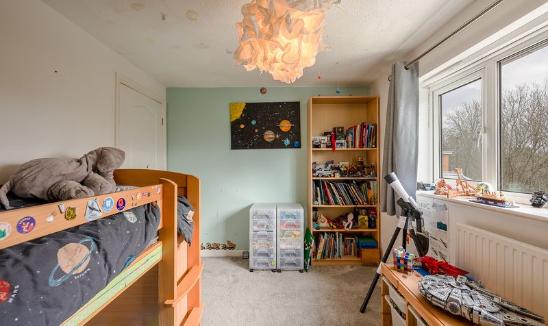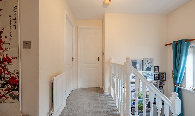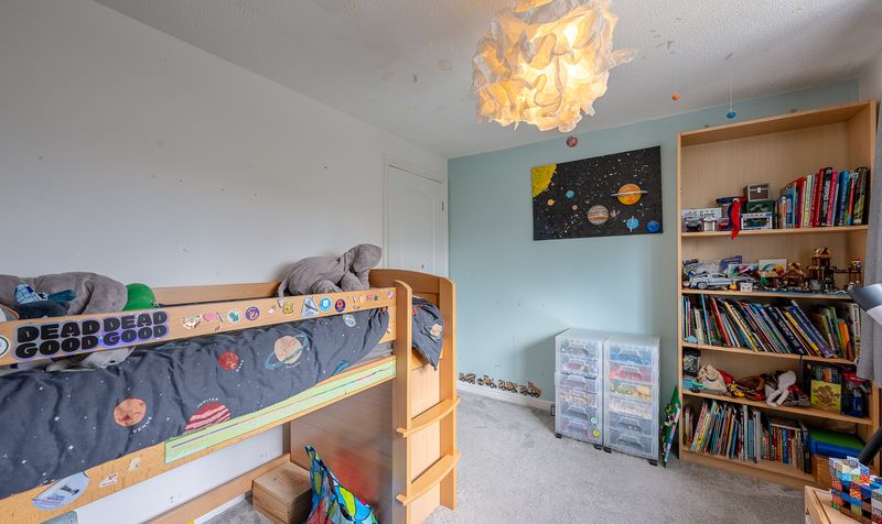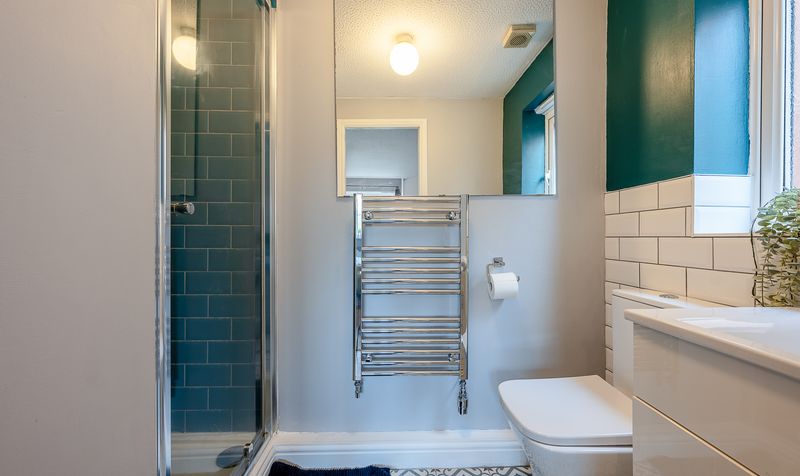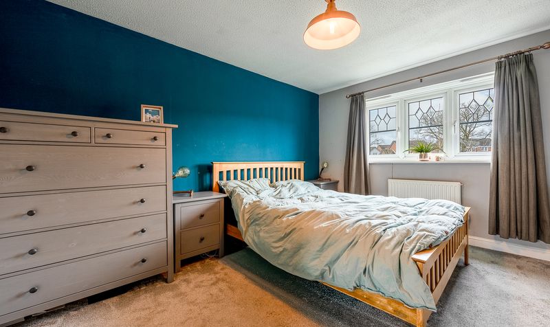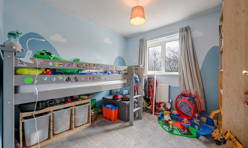 To the first floor, the home continues to impress with three well-proportioned bedrooms, all accessed from a bright and airy landing. The main bedroom is a generous double and benefits from its own en-suite shower room, providing a private retreat for homeowners. The second bedroom is also well-sized and offers comfortable accommodation, while the third bedroom provides flexibility as a child’s room, nursery or home office.