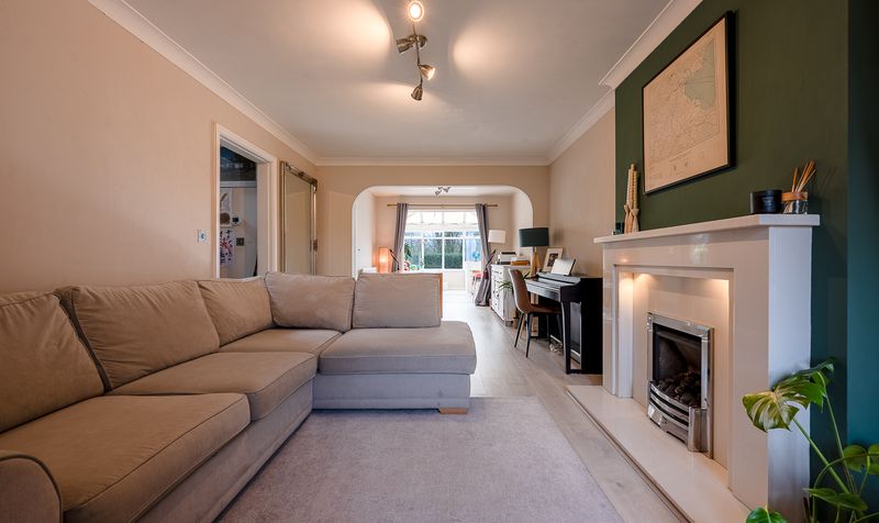 Upon entering, you are greeted by a bright entrance hallway which leads through to the main living spaces. The lounge is a beautifully presented room, featuring a contemporary fireplace with inset fire and a striking feature wall, creating a warm and relaxing atmosphere. The space flows effortlessly into the dining area through an open archway, providing an ideal layout for both everyday family life and entertaining guests.