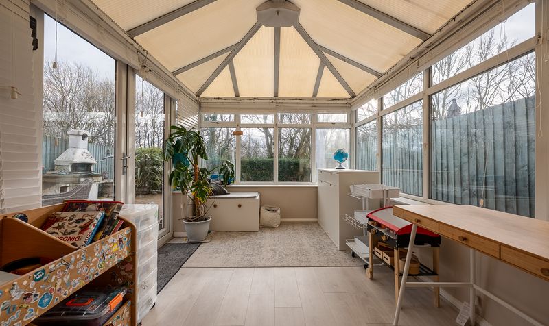 The dining room comfortably accommodates a family-sized table and enjoys pleasant views through to the conservatory beyond. The conservatory provides a wonderful additional reception space, filled with natural light and offering a pleasant outlook over the rear garden. This versatile area is perfect as a second sitting room, playroom, home office or simply a peaceful spot to relax and unwind.