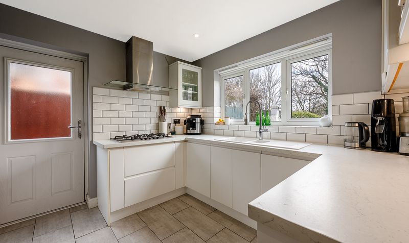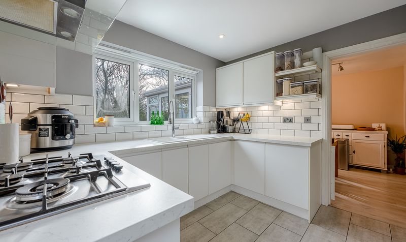The kitchen is modern and stylish, fitted with sleek white cabinetry, metro-style tiled splashbacks and beautiful marble-effect worktops which add a contemporary finish. Thoughtfully arranged, it offers excellent storage and workspace, integrated appliances and a bright outlook, with a side door providing convenient access to the exterior.