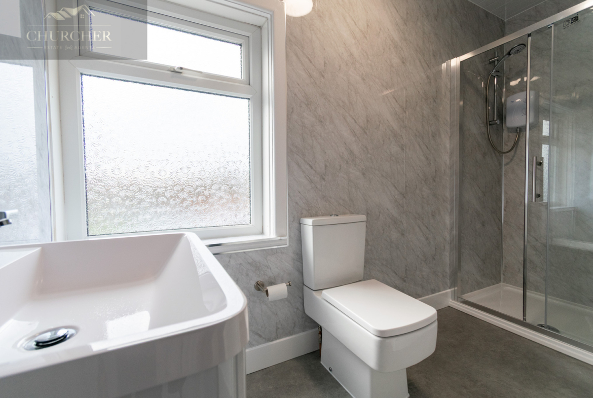 The family bathroom has been stylishly updated, featuring contemporary grey wall panels, a sleek white suite, WC and basin, along with a spacious glass-enclosed shower cubicle. The modern finish gives the room a clean and fresh feel.