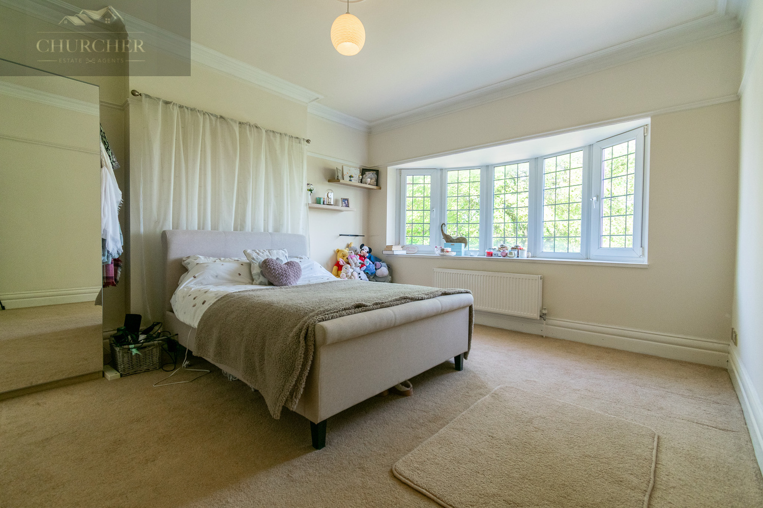 The principal bedroom is a luxurious and expansive retreat, positioned to the front of the property and beautifully finished with soft neutral tones and elegant period detailing. A deep, curved bay window floods the room with natural light while offering views over the mature front gardens. High ceilings with detailed coving, a central chandelier, and generous floor space create a serene and sophisticated atmosphere, making this an ideal setting for both relaxation and rest. The bedroom also leads through to what could be used as a dressing room or additional bedroom. Complementing the bedroom is a stylish, recently renovated en-suite shower room, designed to an excellent modern standard. Featuring a large walk-in shower with rainfall and handheld fixtures, the en-suite is finished with sleek, large-format neutral tiling, a floating vanity unit with LED-lit mirror, and a contemporary WC-offering both practicality and luxurious comfort.