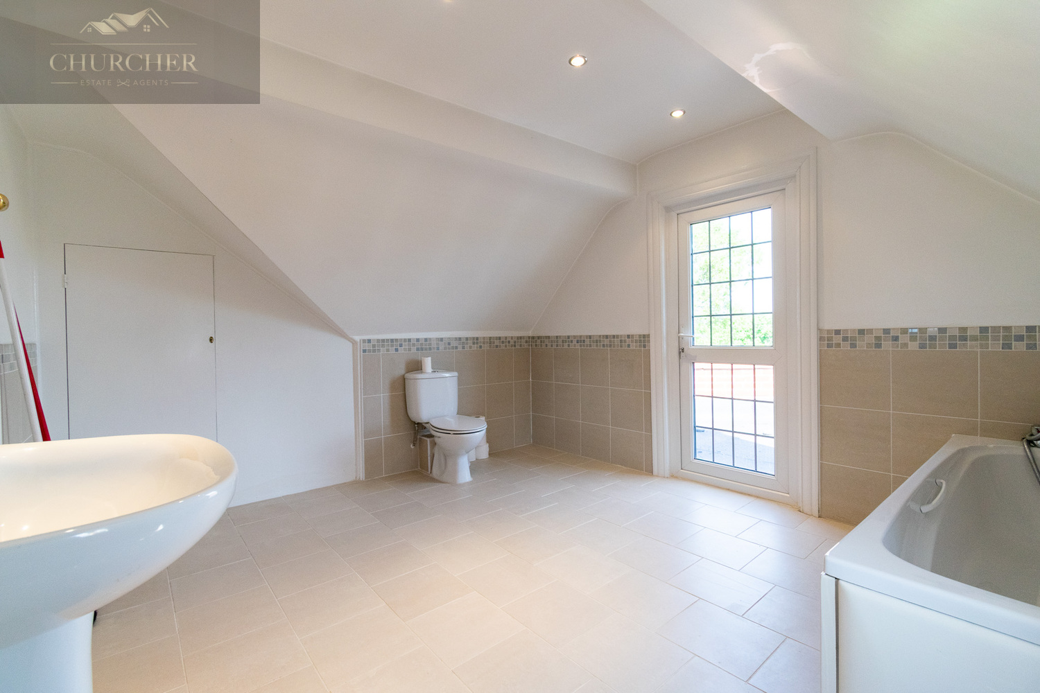 The second-floor hosts two additional bedrooms, both generously proportioned and full of character thanks to the distinctive sloped ceilings and dormer-style windows. It also features a large, well-lit bathroom with a pitched ceiling and a combination of floor and wall tiling. The room includes a full-sized bath, pedestal sink, and WC, and is flooded with natural light thanks to a full-height glazed door and window that lead out onto a private balcony-offering a lovely, elevated view over the garden and beyond.