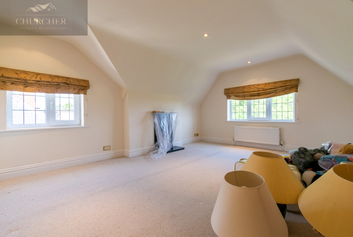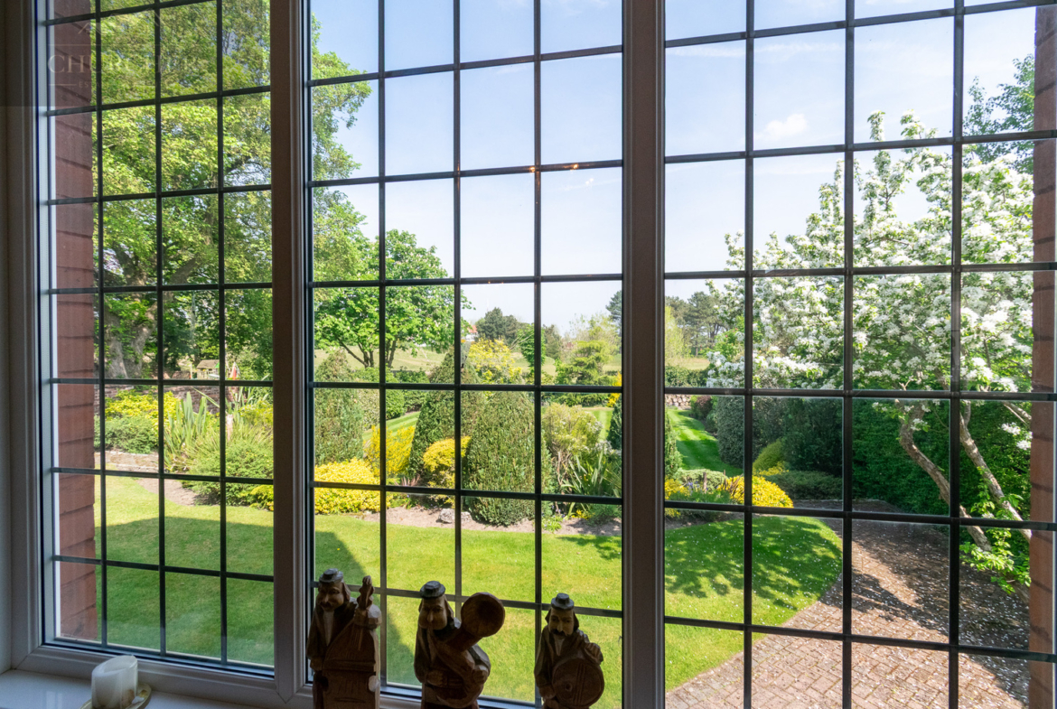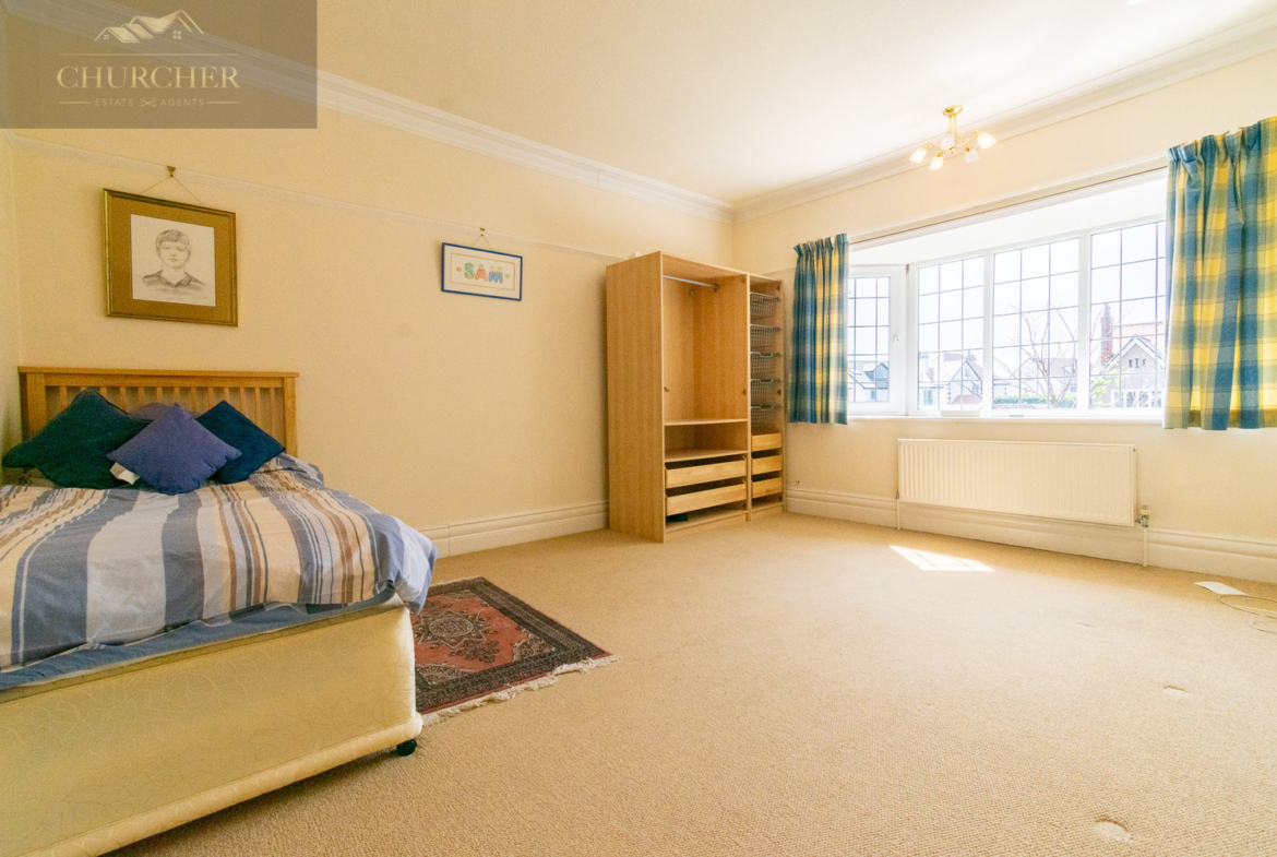 The first bedroom to the right as you walk up the stairs is a vast, light-filled space that makes the most of the property’s peaceful, elevated position. It features a striking bay window with panoramic views over the golf course and landscaped gardens, while fresh neutral décor and soft carpets create a calm, comfortable atmosphere. Its generous proportions offer ample space for both sleeping and relaxing, with clear potential for a dressing area or private seating zone.