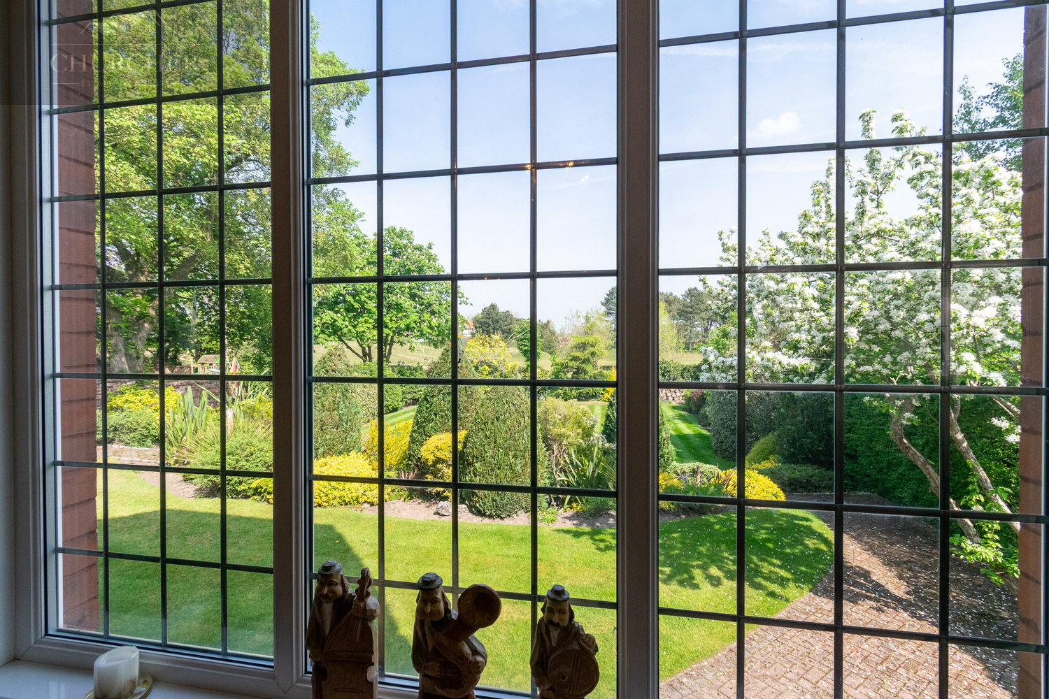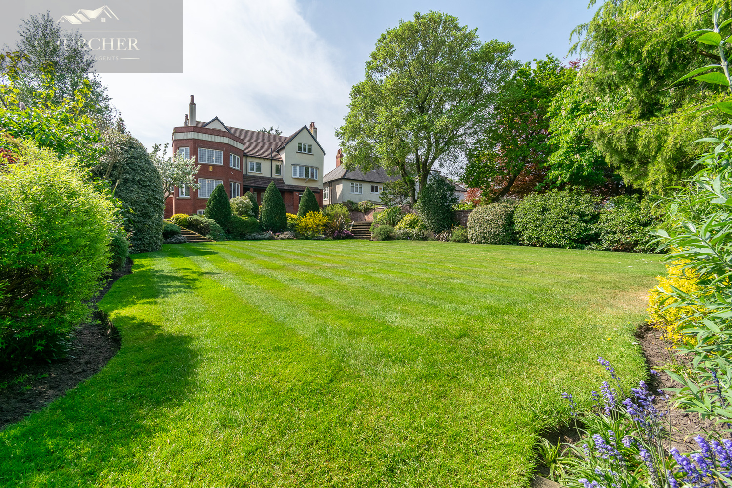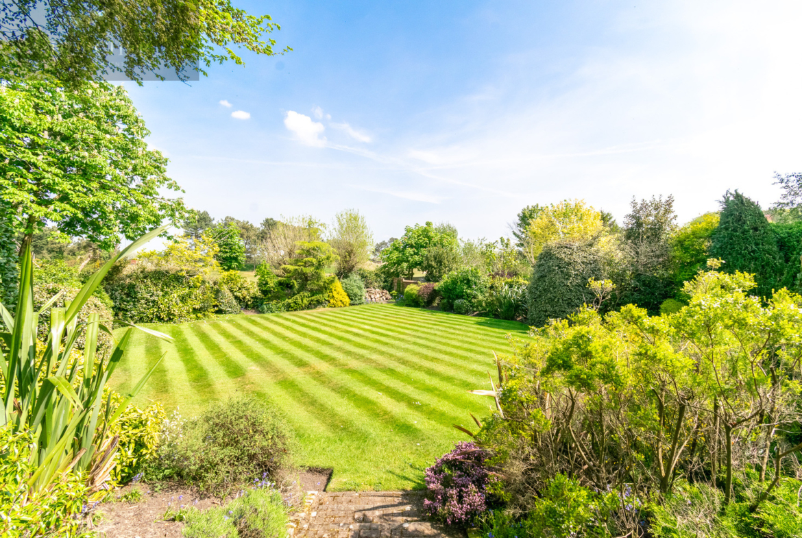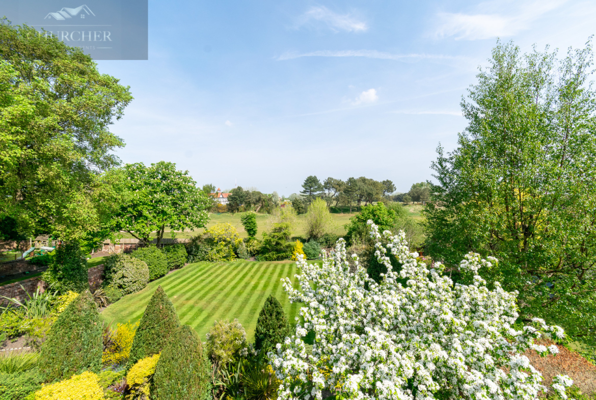 The rear garden is a private, beautifully landscaped space designed for both relaxation and entertaining. A broad patio leads to manicured lawns bordered by richly planted beds, specimen trees, and mature hedging. Stone steps lead to the main lawn, with open views stretching across the greenery to Hesketh Golf Club. The garden’s design offers a perfect balance of structure and softness, privacy and openness.