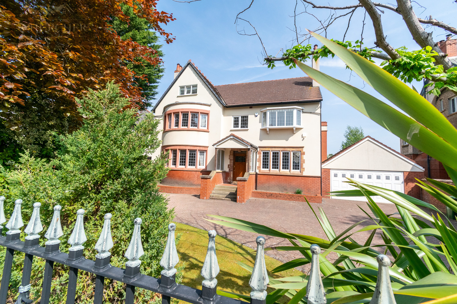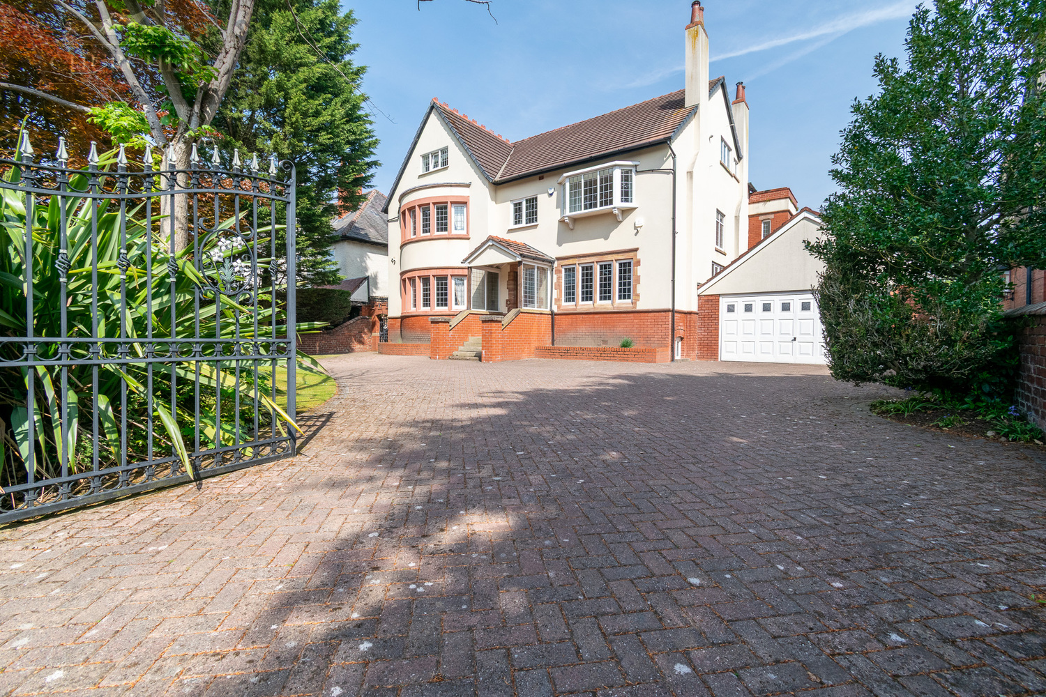 Externally, the front of the property makes a striking first impression with its distinctive architecture and curved bay frontage. The secure wrought iron gates open onto a spacious forecourt with turning space, lawned areas, and a strong sense of privacy and security. Mature planting frames the entrance beautifully, reinforcing the exclusivity of this remarkable home. There is a large driveway with ample amounts of parking for multiple cars.