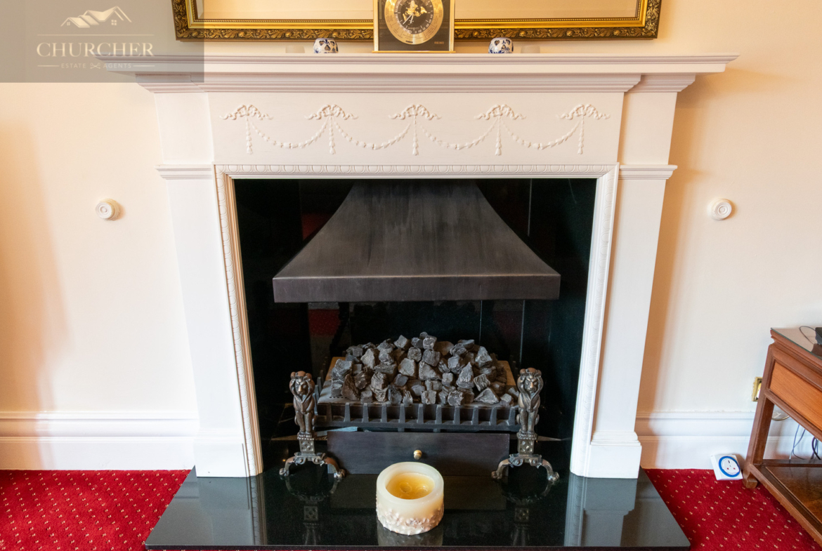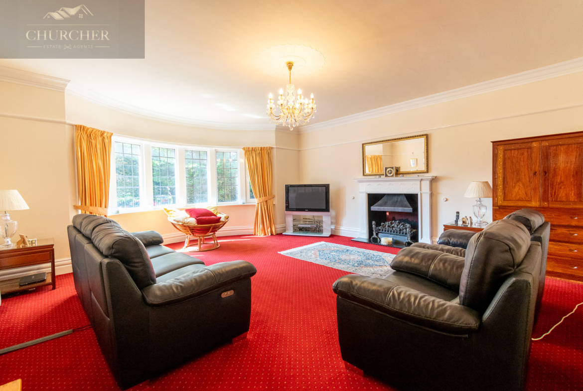Leading off from the hallway is the principal lounge which is flooded with light from a sweeping curved bay window and centred around a striking decorative fireplace. High ceilings, intricate cornicing, and classic styling create an elegant yet inviting space. To the rear of the property, the spacious family room provides a more informal and equally impressive living space. This dual-aspect room is flooded with natural light thanks to a wide bank of windows and French doors that open directly onto the garden. The standout feature is the striking dark wood fireplace and overmantel, which adds a strong sense of character and grandeur. From here, views stretch over the beautifully maintained gardens and beyond to Hesketh Golf Club, offering a sense of space, privacy, and natural beauty that is rarely found.