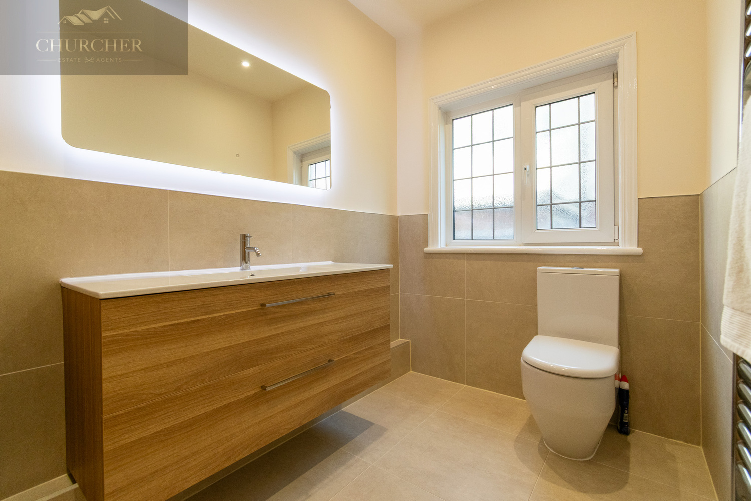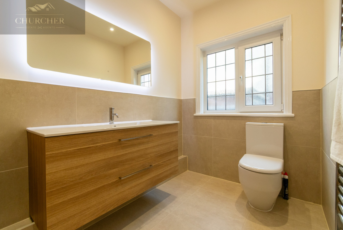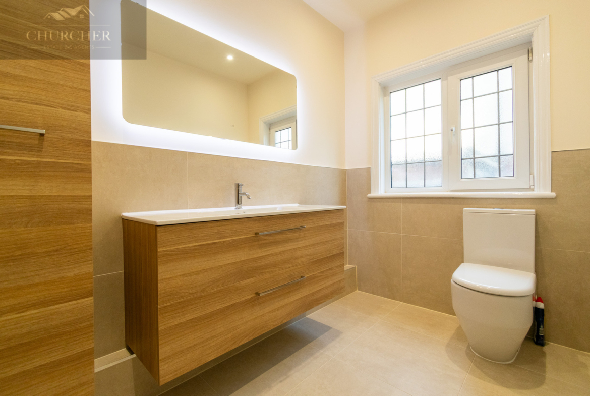 The ground floor is completed by a recently refurbished downstairs WC, featuring sleek modern tiling, a floating wood-effect vanity unit, LED-lit mirror and a contemporary suite. The quality of finish gives this space a clean, stylish and practical feel, perfect for guests and family use alike.
