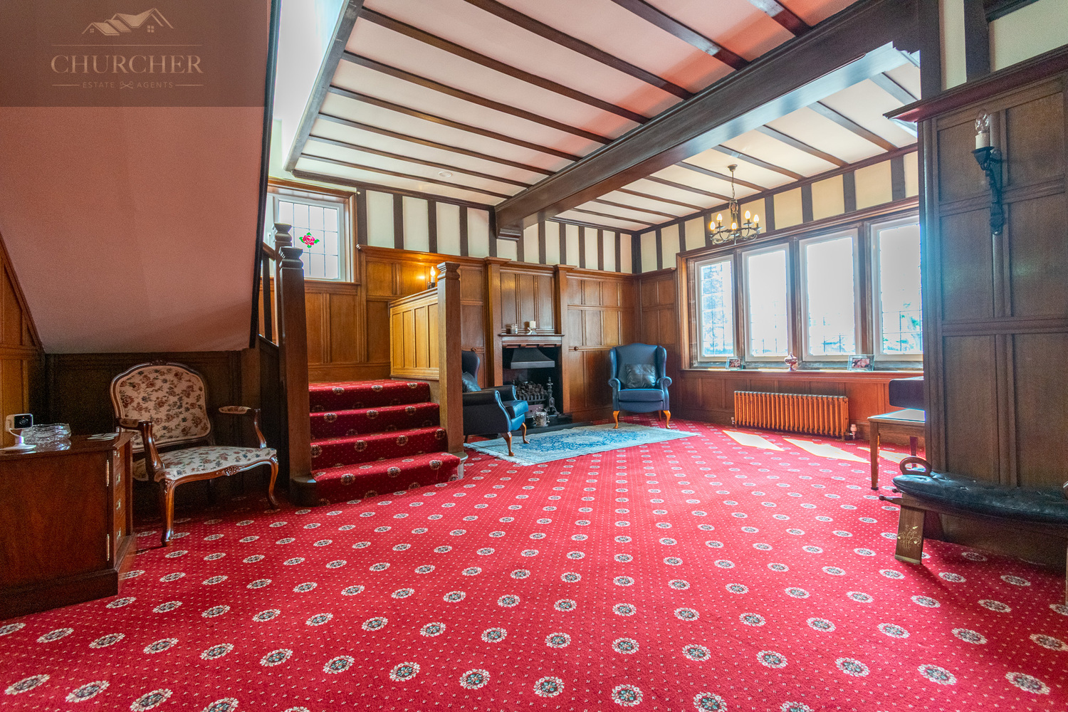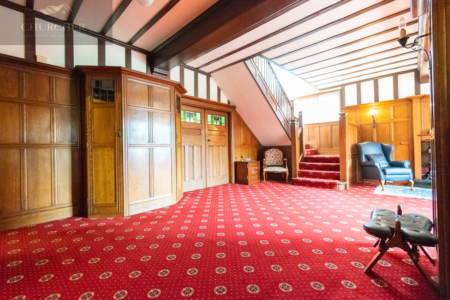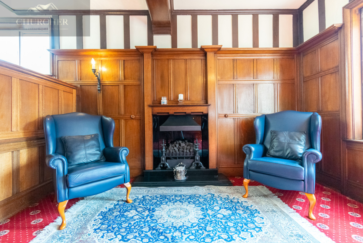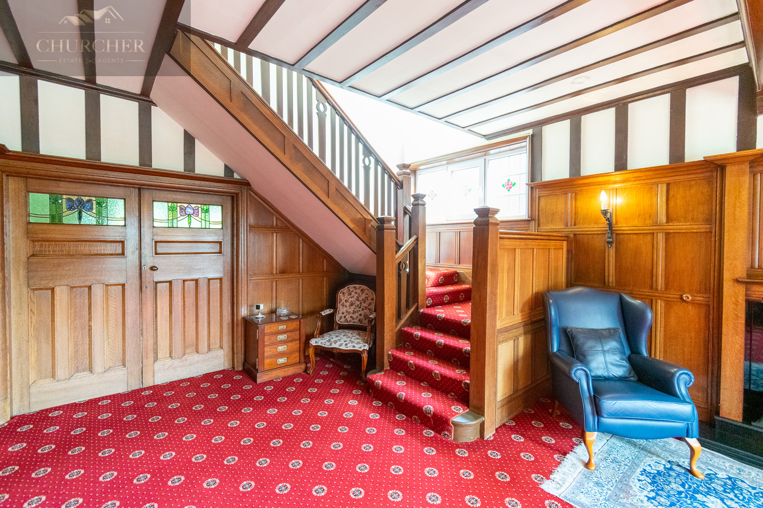 Entry into the property is via the original front door, which opens into a welcoming entrance hallway. From here, you step into the grand reception hallway-a truly striking space that immediately sets the tone for the character and scale found throughout the home. The hallway boasts stunning oak panelling, exposed timber beams, stained glass features, and a beautiful fireplace.
