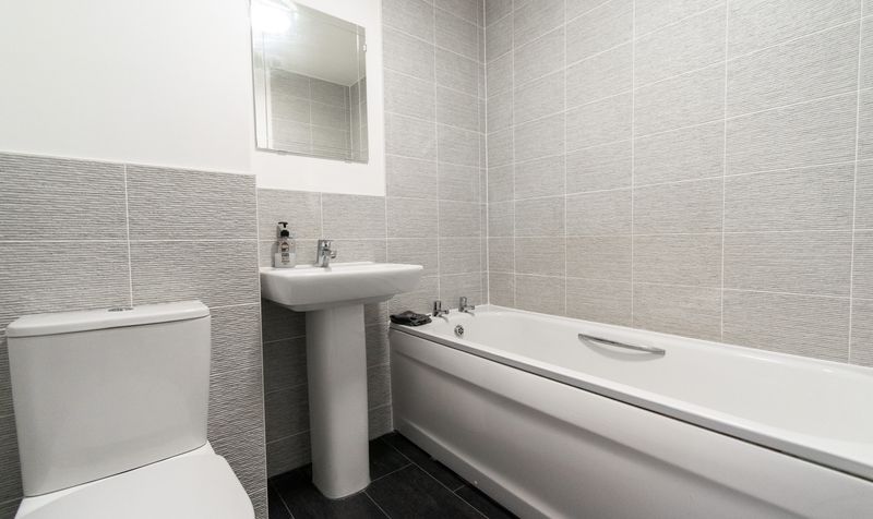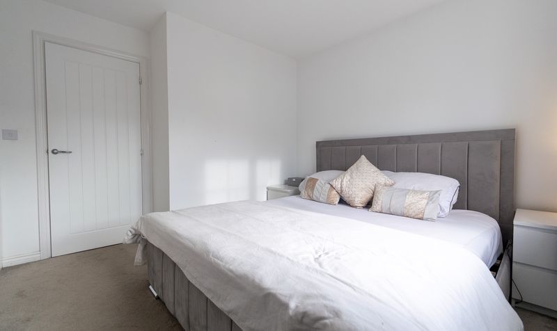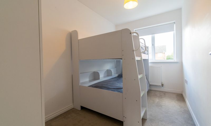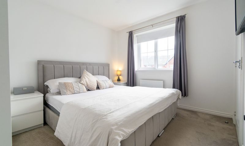 Upstairs, the property continues to impress with three well-proportioned bedrooms. The main bedroom is a serene retreat, featuring a luxurious feel with soft grey tones and an abundance of natural light. It benefits from its own modern ensuite shower room, finished in elegant grey tiling and chrome fixtures. The second bedroom is a comfortable double, while the third room makes an excellent child’s bedroom, nursery, or home office. Completing the first floor is the stylish family bathroom, fitted with a modern white suite and coordinating tiling, offering both bath and shower facilities.