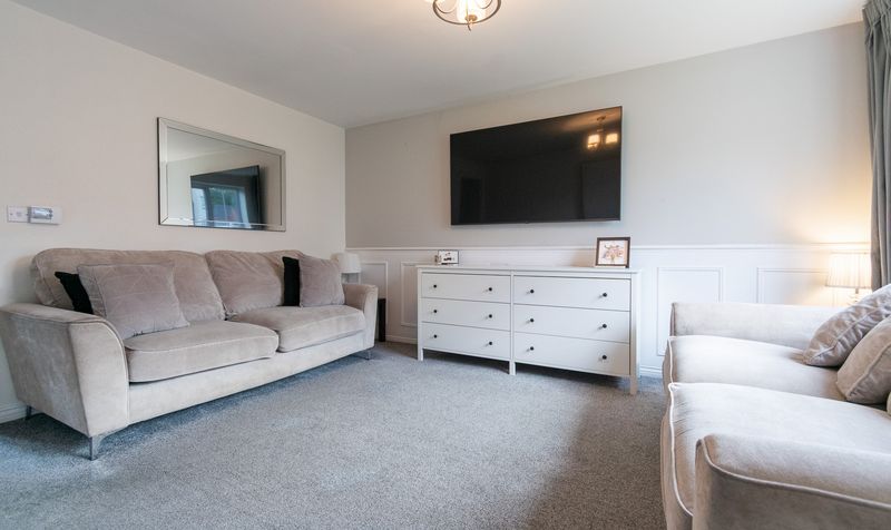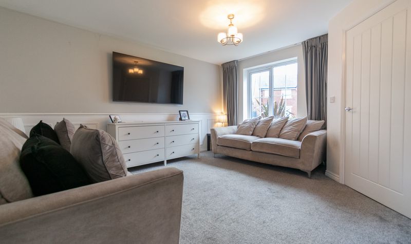 Stepping inside, you are welcomed by a bright and inviting entrance hallway that immediately sets the tone for the home’s modern, well-maintained interior. To the front of the property sits a spacious and elegant lounge, decorated in calming neutral tones with soft carpeting and a large window that floods the room with natural light. The space offers the perfect setting for relaxing evenings or entertaining guests, complemented by tasteful wall panelling and a stylish contemporary finish.