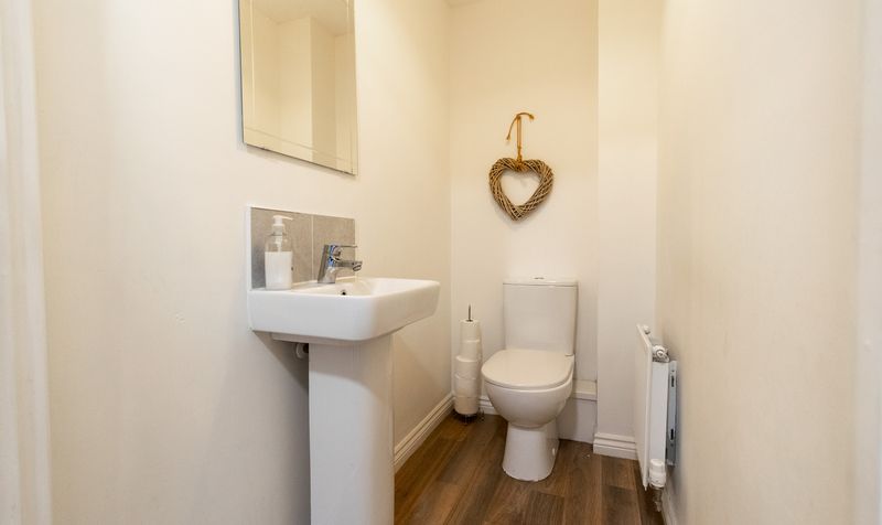 Completing the ground floor is a contemporary downstairs WC and a useful storage cupboard, thoughtfully positioned off the kitchen for added convenience. The WC features a modern white suite with stylish flooring and neutral décor, perfectly complementing the rest of the home’s clean, modern aesthetic. The under-stairs storage provides an ideal space to keep coats, shoes, or household essentials.