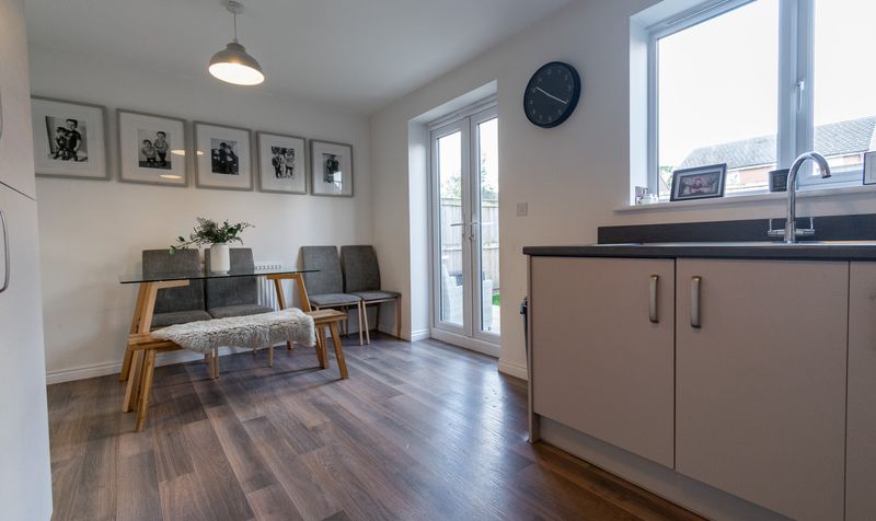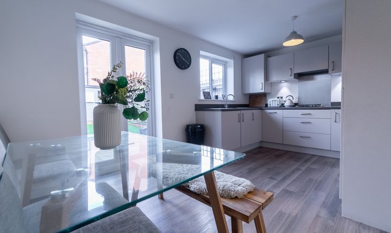 To the rear of the home lies the showstopping open-plan kitchen and dining area – the true heart of this property. The kitchen is fitted with sleek cabinetry, integrated appliances, and contrasting dark worktops, all beautifully complemented by the warm wood-effect flooring. The generous layout allows for a dining area ideal for family meals or hosting friends, with French doors opening directly onto the rear garden, creating a seamless connection between indoor and outdoor living.