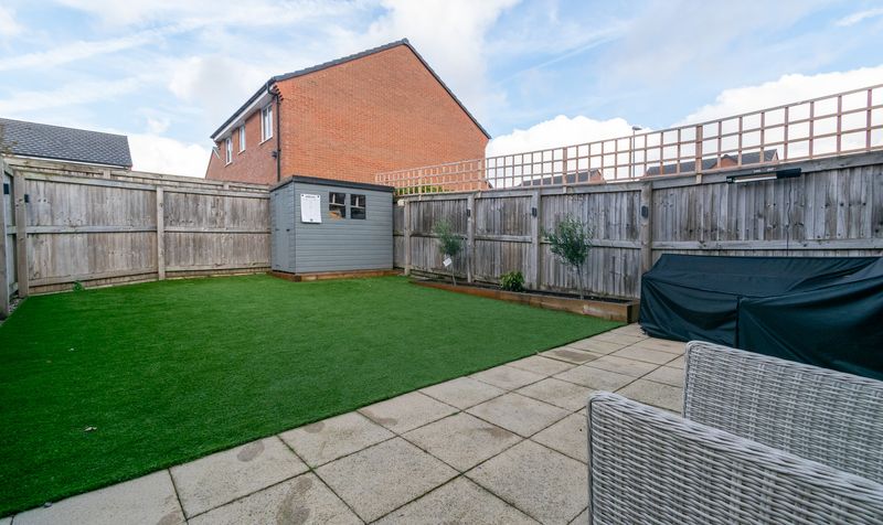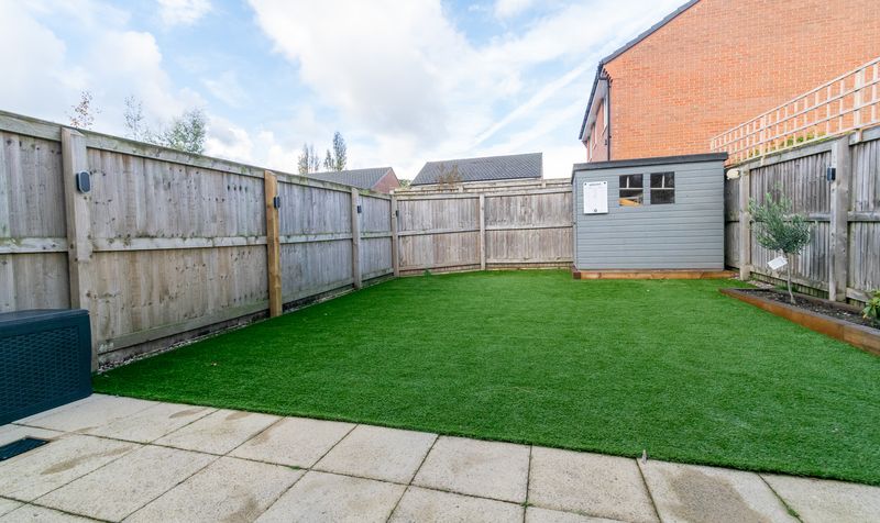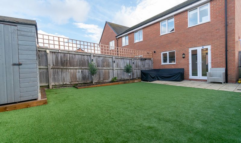 Externally, the home is equally impressive. To the front, there is a well-maintained lawn and driveway providing ample off-road parking. To the rear, the garden has been designed for low-maintenance enjoyment, featuring a large, paved patio area perfect for outdoor dining and a neatly landscaped lawn with artificial grass, ideal for children to play or for relaxing in the sun. A smart garden shed offers additional storage.