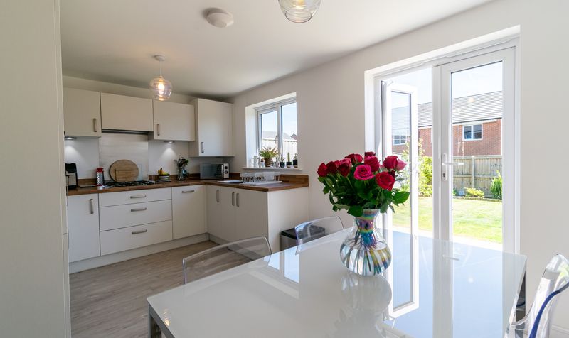 Leading on from the lounge is the heart of the home-a stylish and spacious kitchen/diner, thoughtfully designed for both everyday living and entertaining. Finished to a high standard, it boasts contemporary white cabinetry with sleek handles, warm wooden worktops, and integrated appliances for a clean, seamless finish. Abundant natural light floods the space through dual aspect windows and French doors, which open directly onto the rear garden, creating a wonderful sense of indoor-outdoor living. The dining area easily accommodates a family-sized table and is illuminated by modern pendant lighting, making this a warm and welcoming space for meals and gatherings.