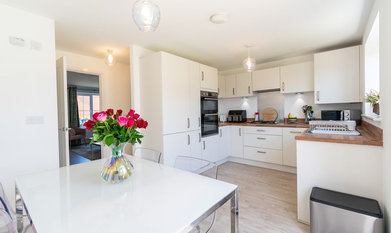 Leading on from the lounge is the heart of the home-a stylish and spacious kitchen/diner, thoughtfully designed for both everyday living and entertaining. Finished to a high standard, it boasts contemporary white cabinetry with sleek handles, warm wooden worktops, and integrated appliances for a clean, seamless finish. Abundant natural light floods the space through dual aspect windows and French doors, which open directly onto the rear garden, creating a wonderful sense of indoor-outdoor living. The dining area easily accommodates a family-sized table and is illuminated by modern pendant lighting, making this a warm and welcoming space for meals and gatherings.