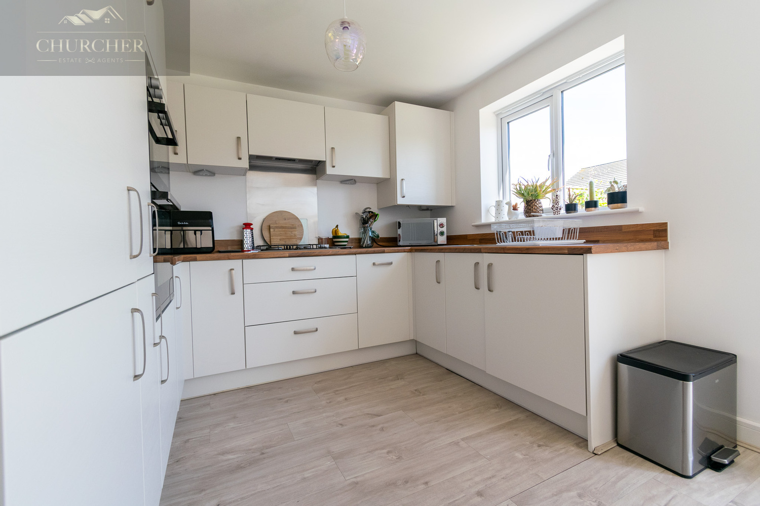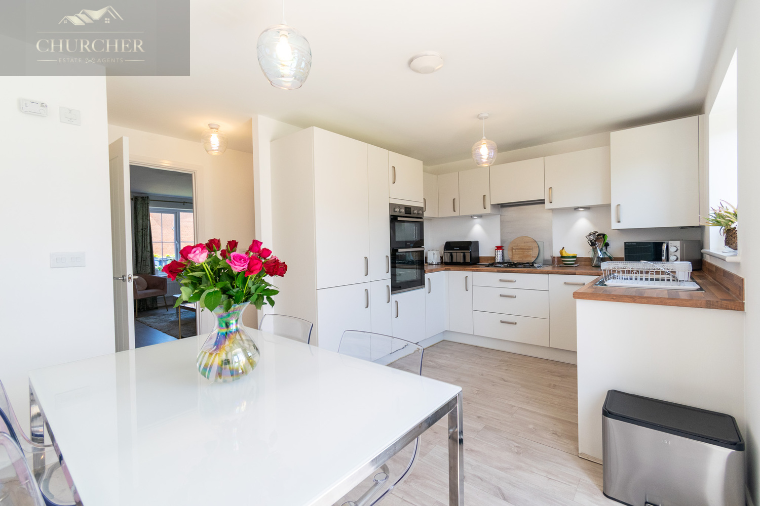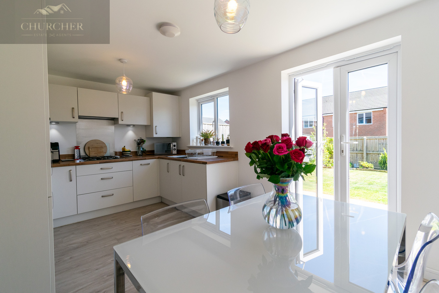 Leading on from the lounge is the heart of the home-a stylish and spacious kitchen/diner, thoughtfully designed for both everyday living and entertaining. Finished to a high standard, it boasts contemporary white cabinetry with sleek handles, warm wooden worktops, and integrated appliances for a clean, seamless finish. Abundant natural light floods the space through dual aspect windows and French doors, which open directly onto the rear garden, creating a wonderful sense of indoor-outdoor living. The dining area easily accommodates a family-sized table and is illuminated by modern pendant lighting, making this a warm and welcoming space for meals and gatherings.