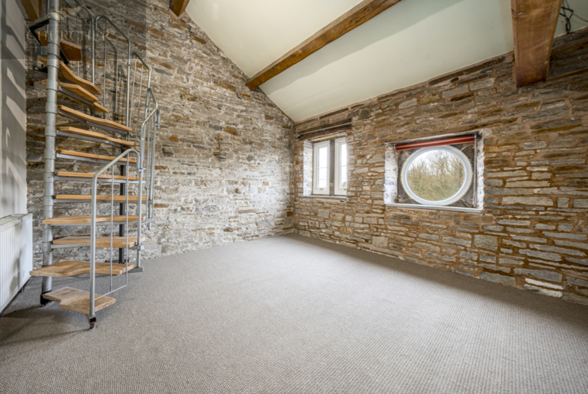 The main bedroom is a true highlight, featuring stunning triangular arch beams, exposed brick detail, and a charming circular window that adds a unique farmhouse feel. This bedroom also includes a staircase leading to a mezzanine floor, which offers potential as a dressing room or additional storage.