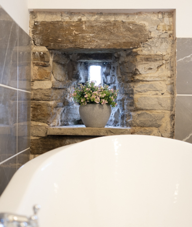 The family bathroom is finished to a high standard, with neutral tiles on the floor and half-height walls, paired with white-painted upper walls and exposed ceiling beams. The bathroom includes a walk-in shower, a free-standing bath, a toilet, and a stylish blue vanity unit that adds a pop of colour and elegance.
