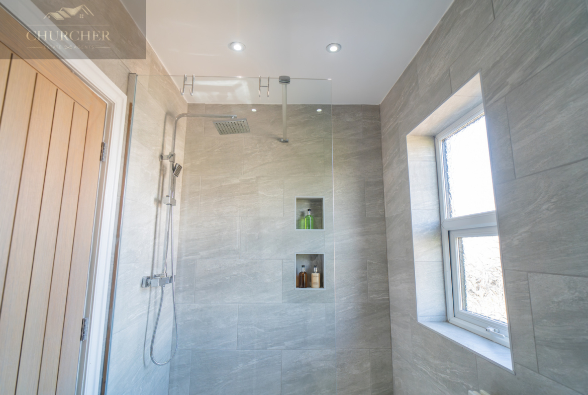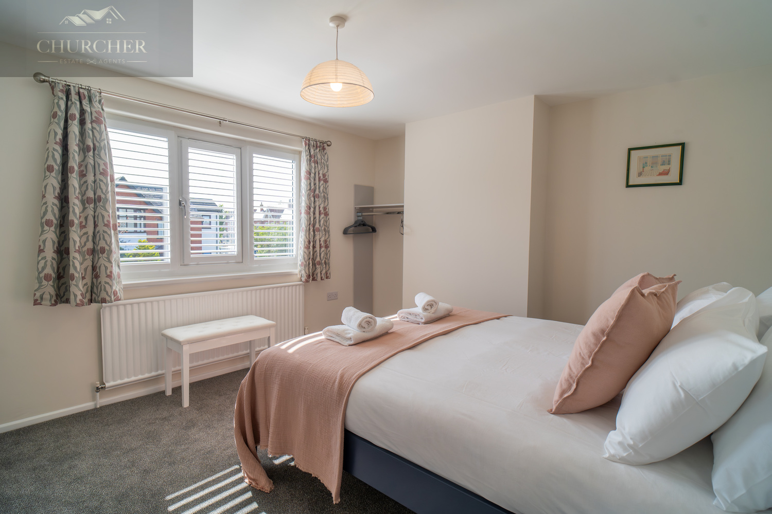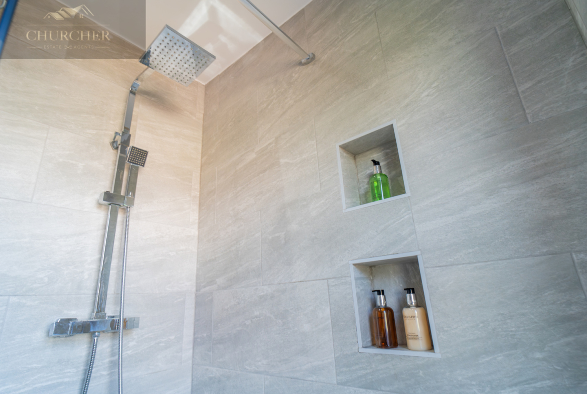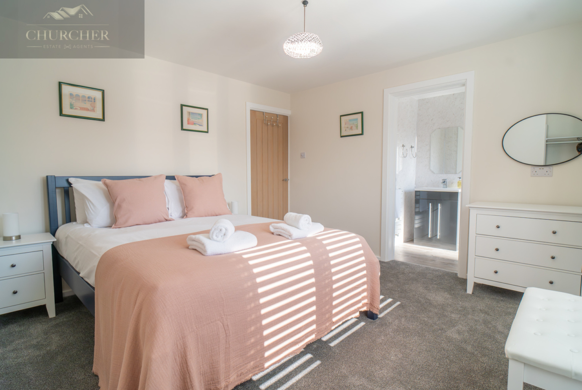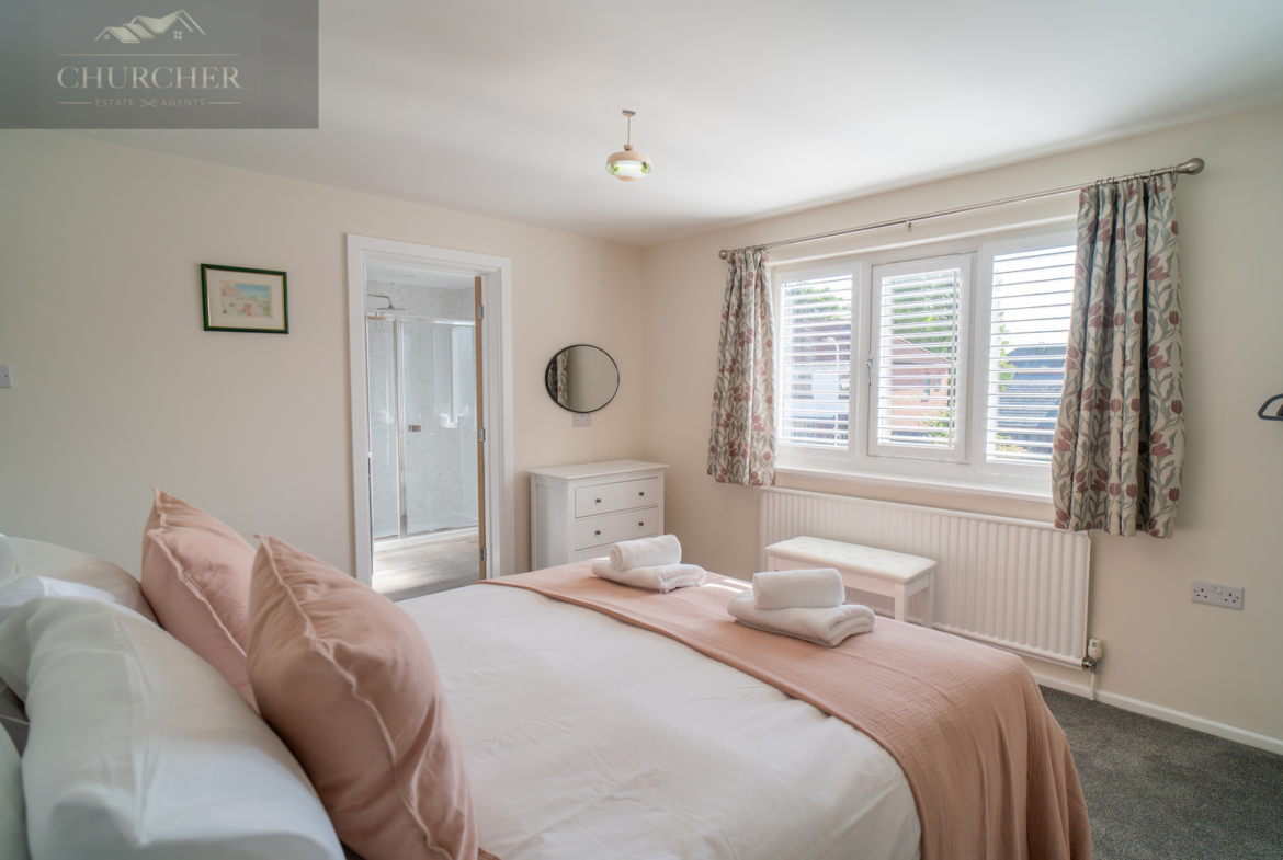 Upstairs, the property continues to impress with two exceptionally presented bedrooms. The main bedroom offers a king-size bed dressed in soft blush tones, complemented by large windows with plantation shutters framing leafy residential views. The sense of space and serenity is ideal for guests seeking restful nights during tournament week. Leading directly from the main bedroom is a contemporary en-suite shower room, beautifully appointed with sleek tiling, a rainfall shower, inset shelving, and a stylish vanity.