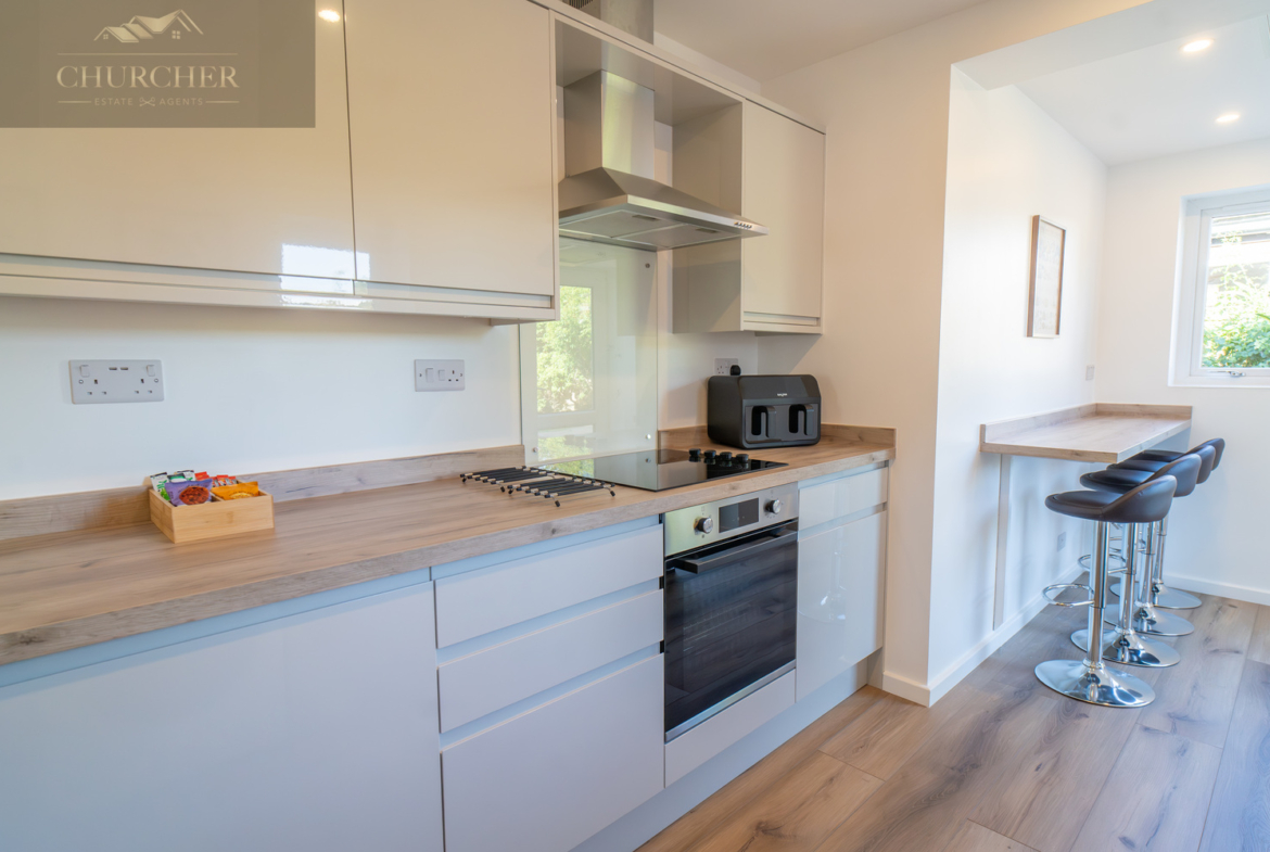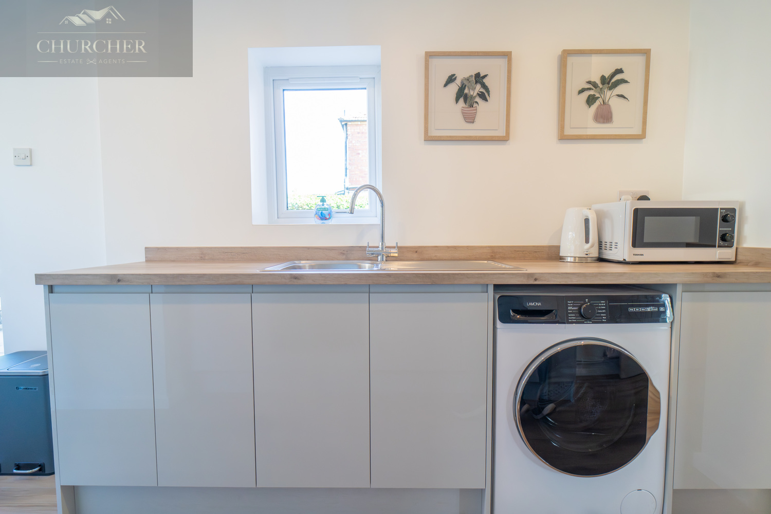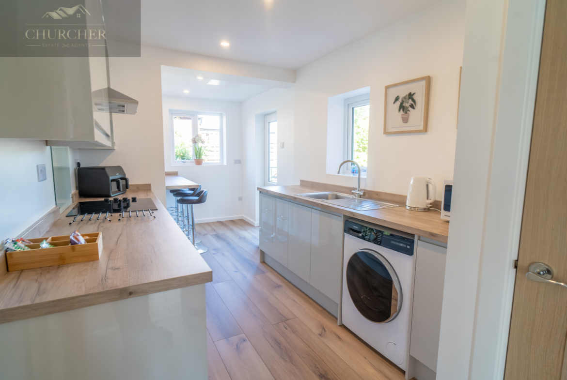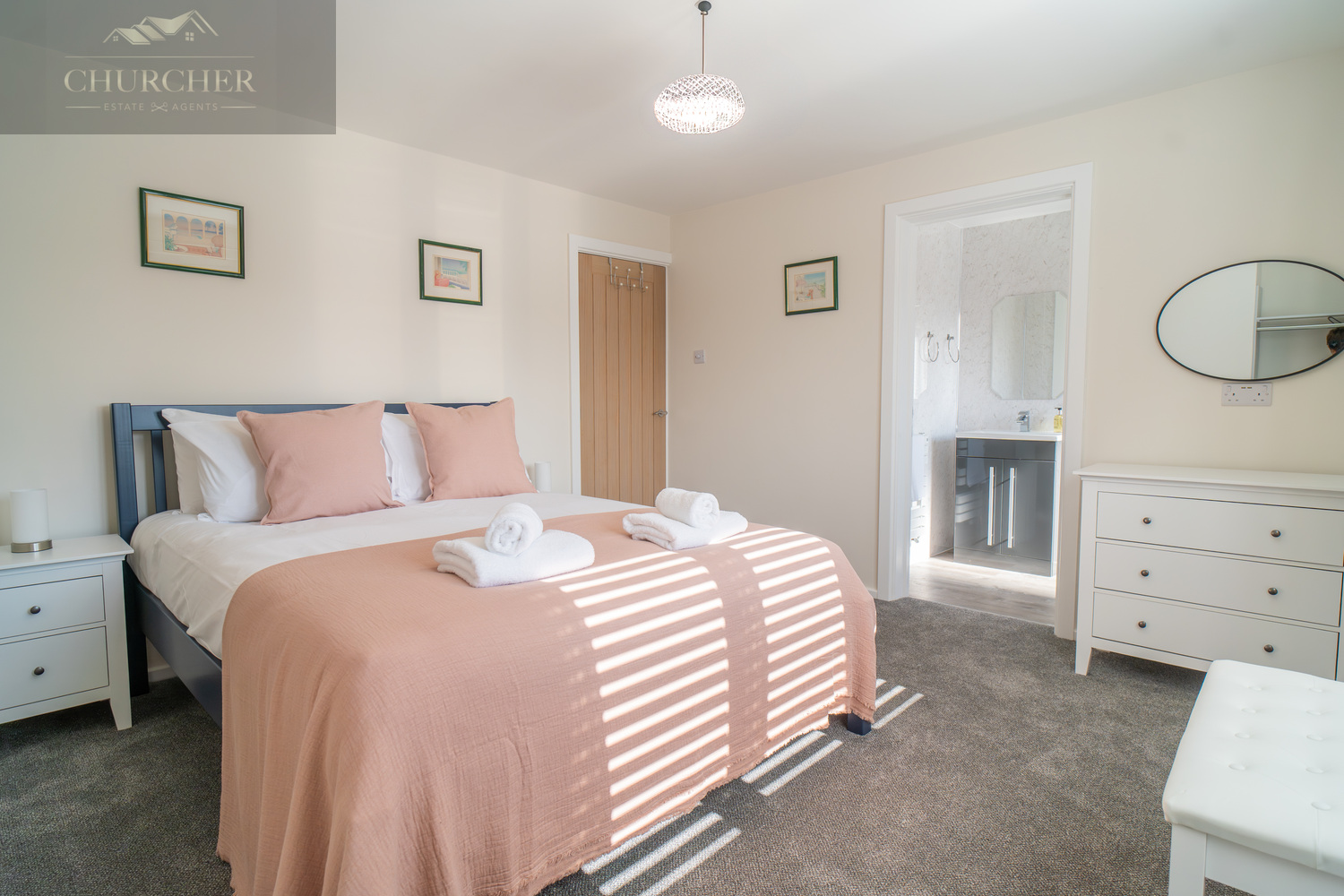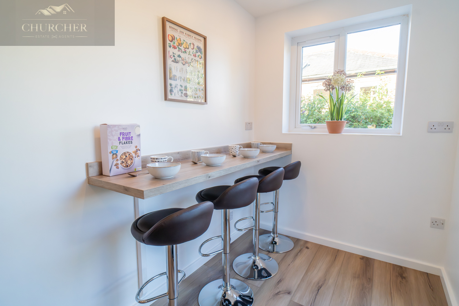 The kitchen has been finished to an exceptional standard, combining modern design with everyday practicality. High-gloss cabinetry, integrated appliances, and generous worktops complement the sleek aesthetic, while multiple windows bathe the room in natural light. A dedicated breakfast bar offers a perfect spot to start the day, with views across the garden. Thoughtful touches-such as elegant tableware, feature artwork, and a welcoming bottle of Prosecco-add a boutique feel synonymous with high-end holiday living.