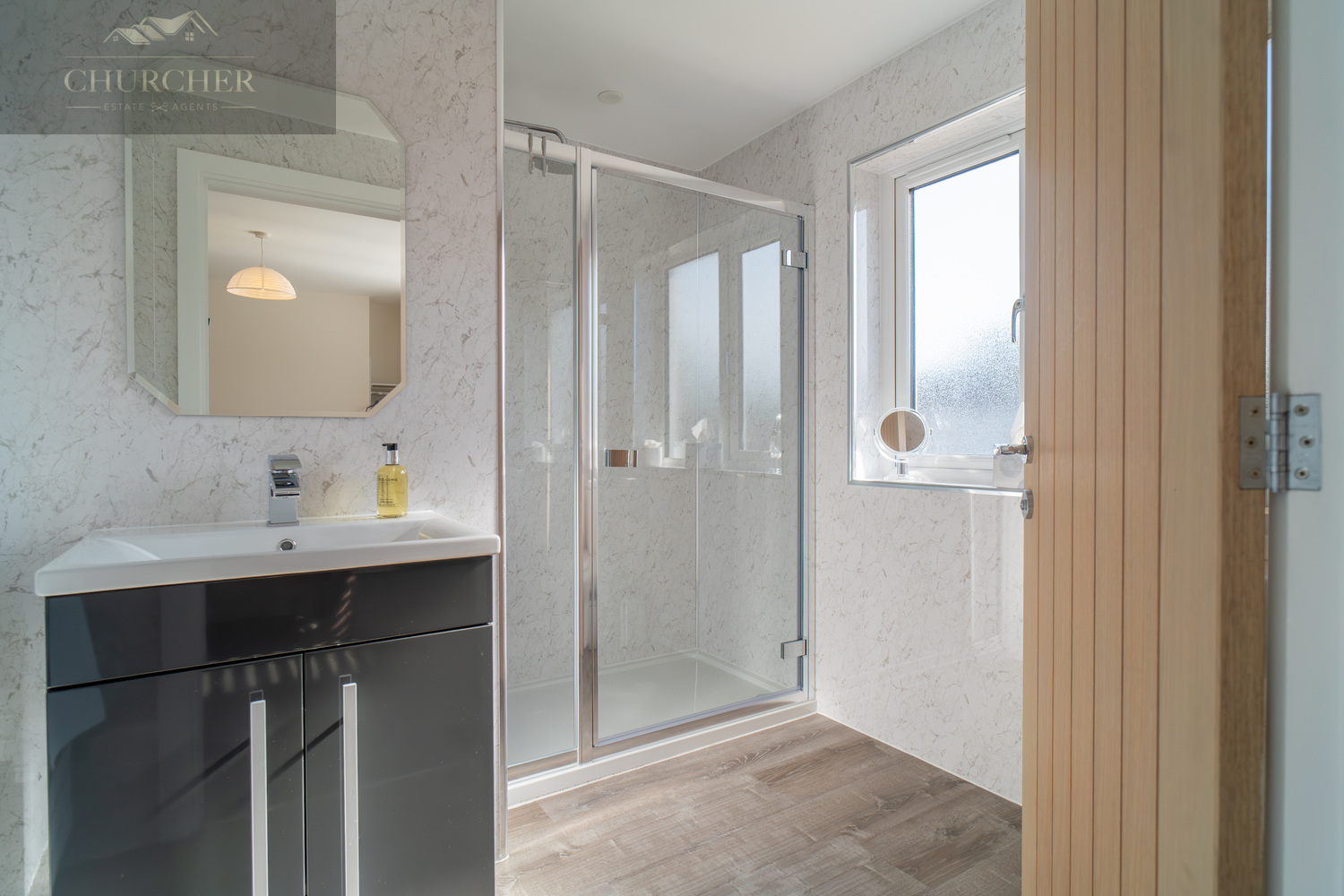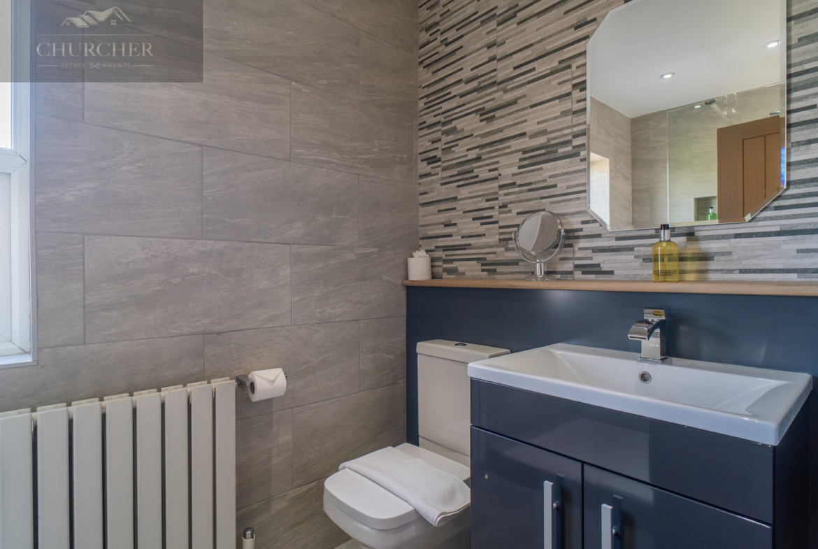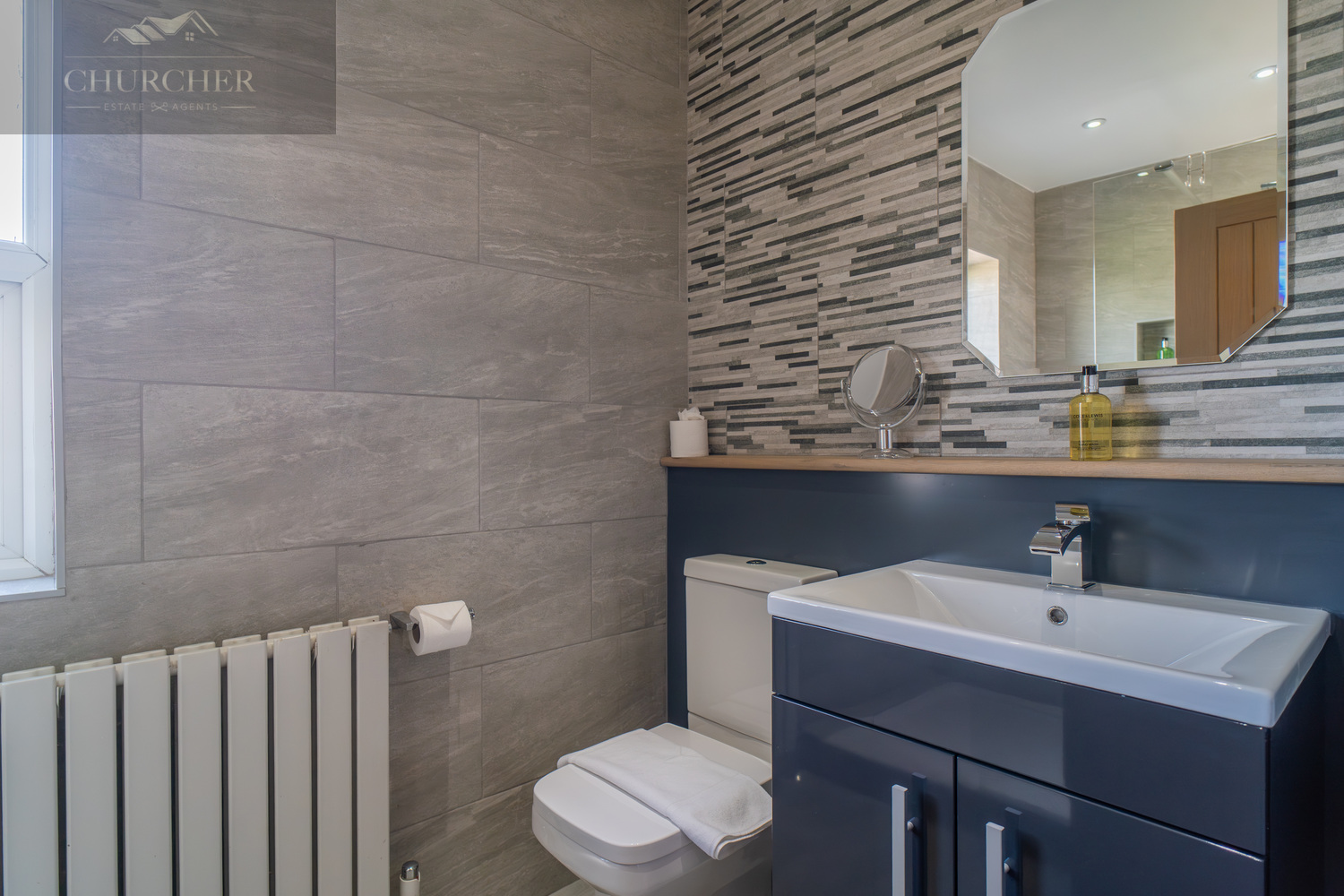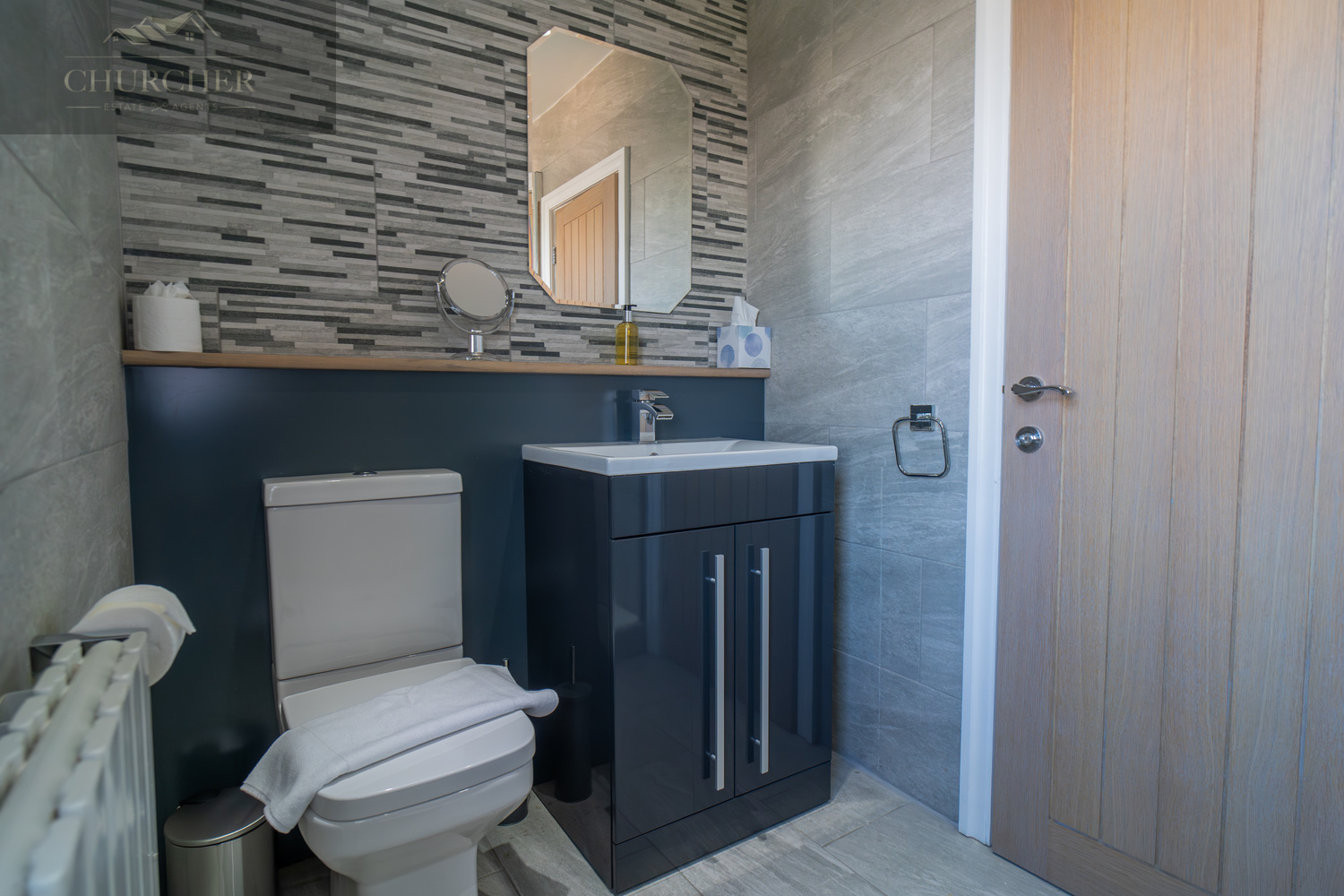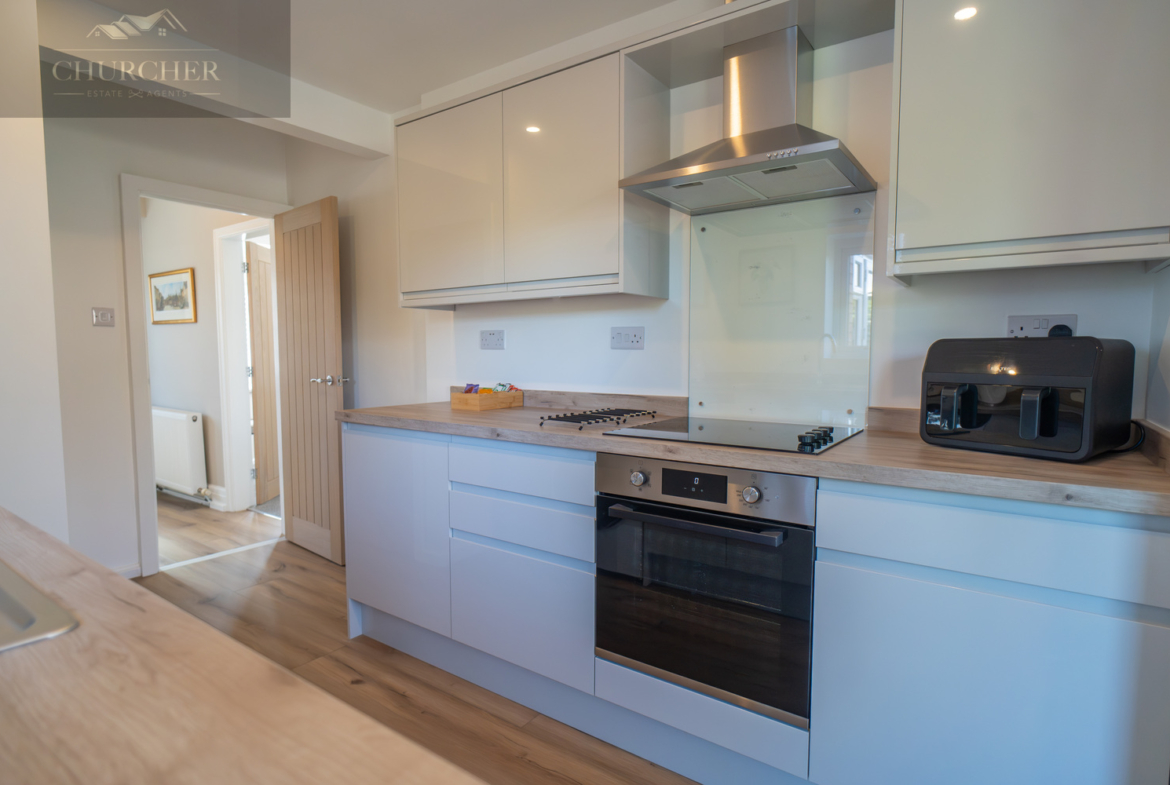 The kitchen has been finished to an exceptional standard, combining modern design with everyday practicality. High-gloss cabinetry, integrated appliances, and generous worktops complement the sleek aesthetic, while multiple windows bathe the room in natural light. A dedicated breakfast bar offers a perfect spot to start the day, with views across the garden. Thoughtful touches-such as elegant tableware, feature artwork, and a welcoming bottle of Prosecco-add a boutique feel synonymous with high-end holiday living.