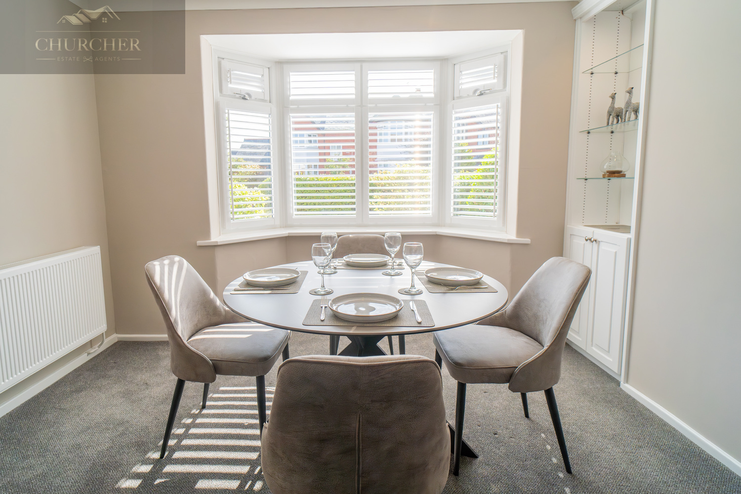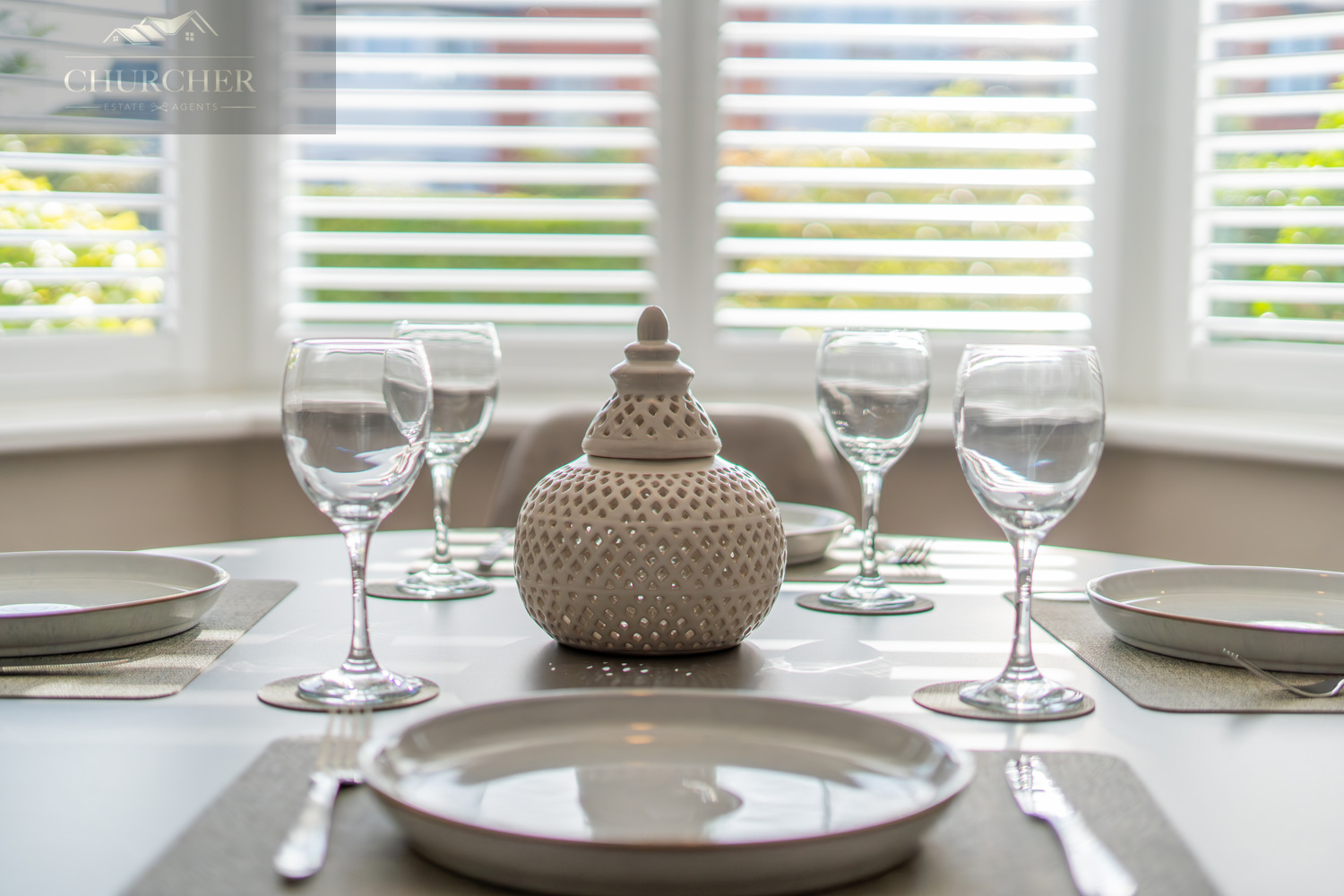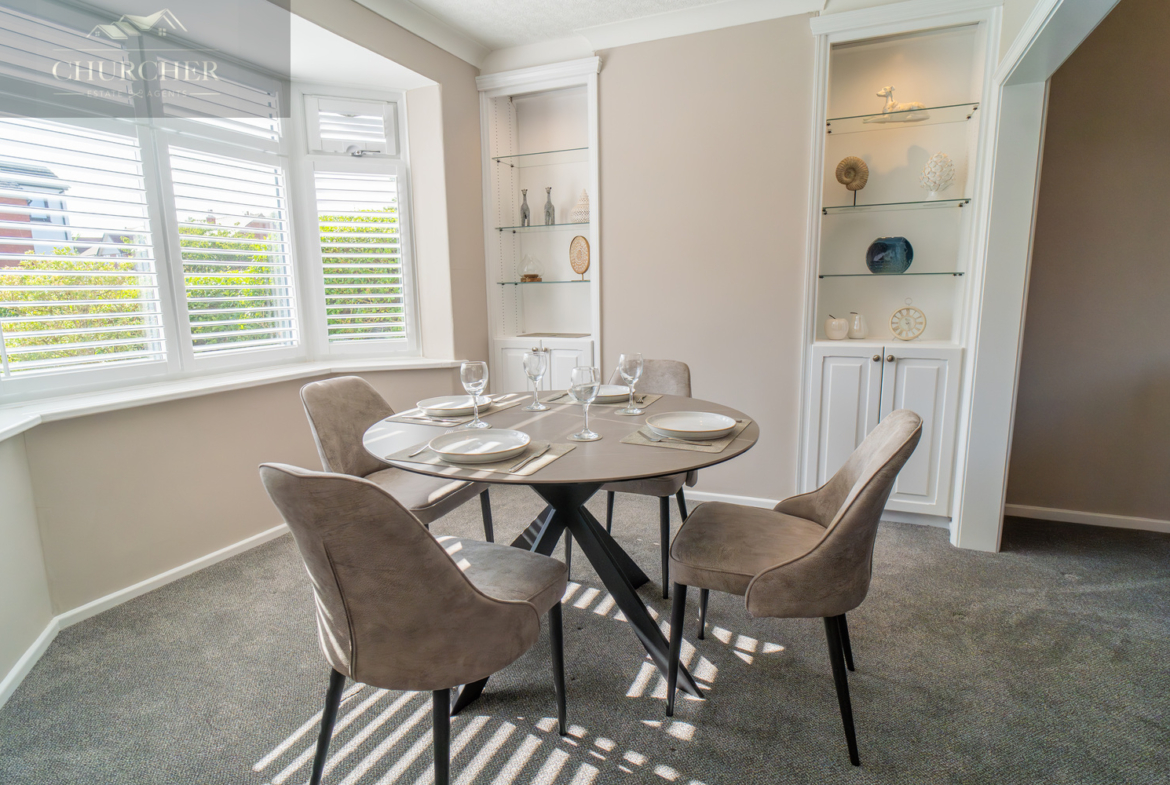 Beyond the kitchen sits the stylish dining room, set within the light of a beautiful front bay window. The room is elegantly furnished with a modern dining suite and built-in lit display cabinets, creating the perfect space for relaxed evening meals or entertaining guests. The continuity of décor and the soft palette throughout ensure each room flows effortlessly into the next.