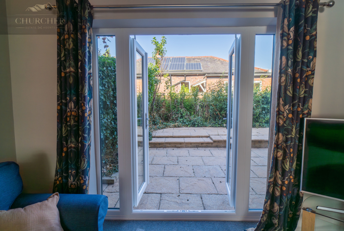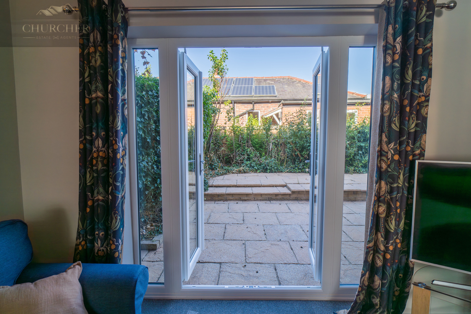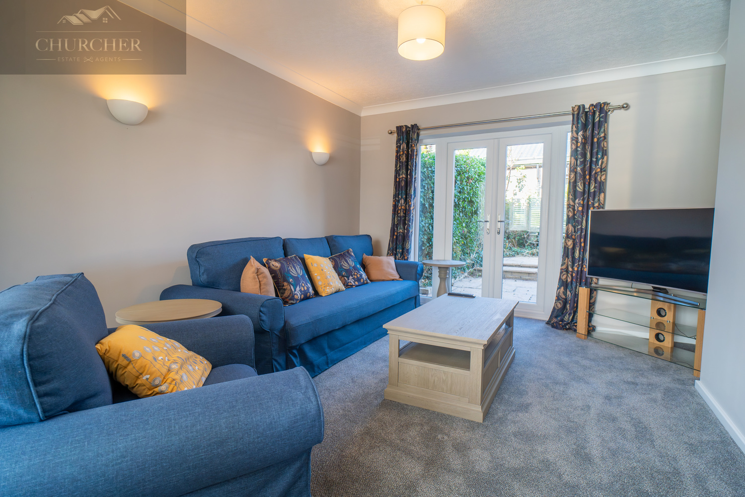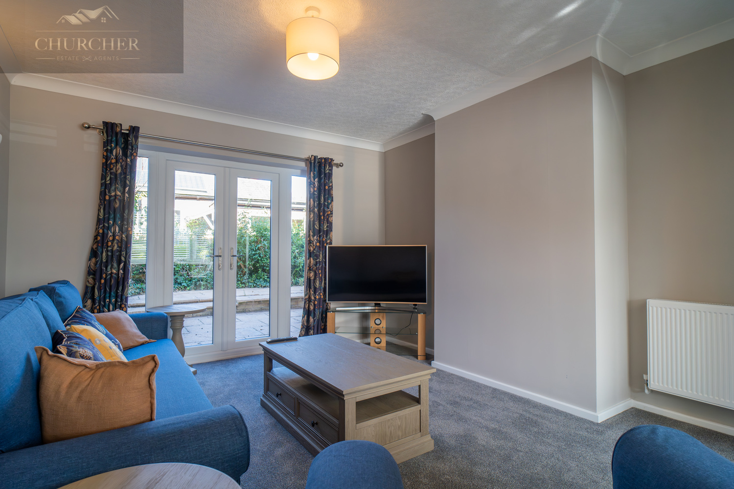 To the rear of the ground floor is the wonderfully spacious lounge-an inviting, comfortable setting complete with a king-size sofa bed, tasteful textiles, and a large TV for leisurely evenings. French doors lead directly out to the rear patio, allowing the room to be flooded with sunlight while seamlessly merging indoor and outdoor living. The view of the private garden beyond offers tranquillity and the perfect spot to unwind after a day at The Open.