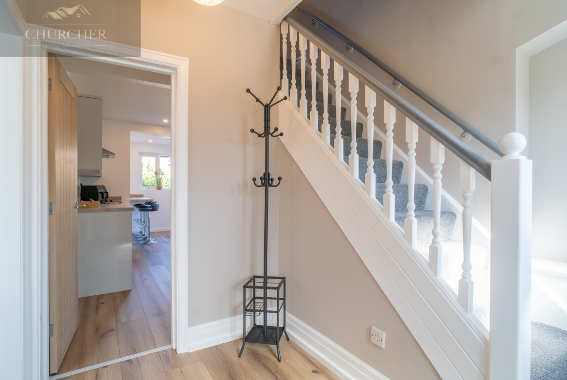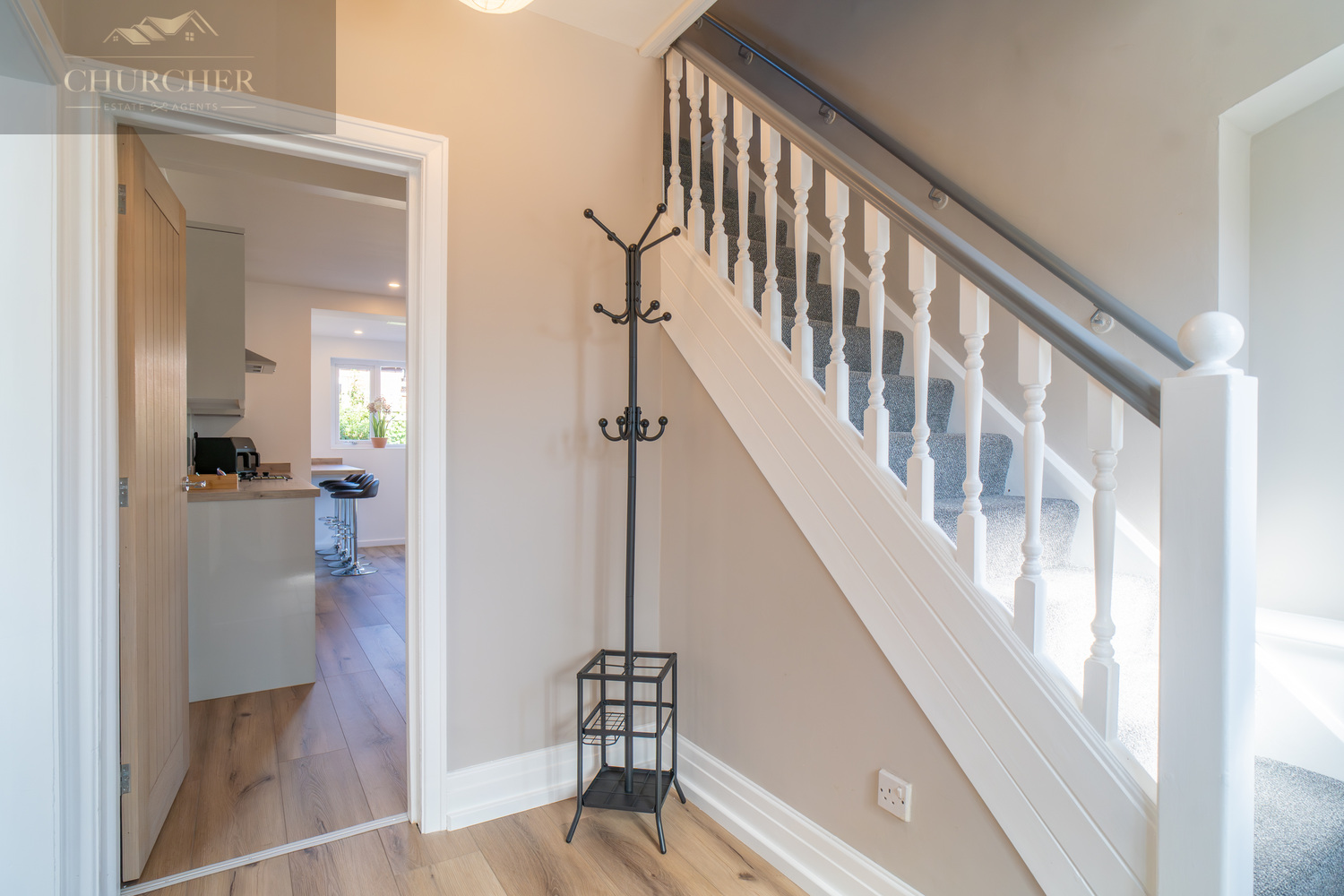 Set behind an attractive frontage with bay windows and manicured shrubs, the property welcomes you into a bright and inviting entrance hallway. Soft neutral décor, warm timber-style flooring, and a contemporary staircase create an immediate sense of calm, setting the tone for the refined accommodation beyond. From here, the hallway flows naturally into the heart of the home.