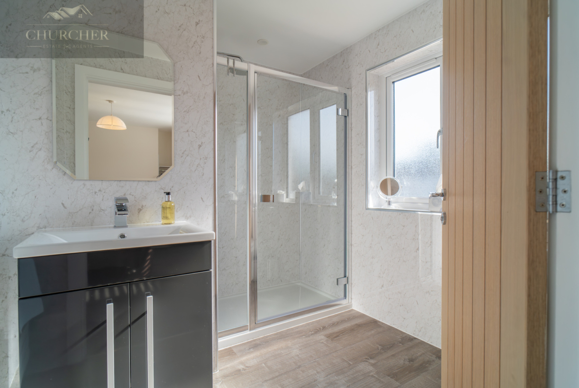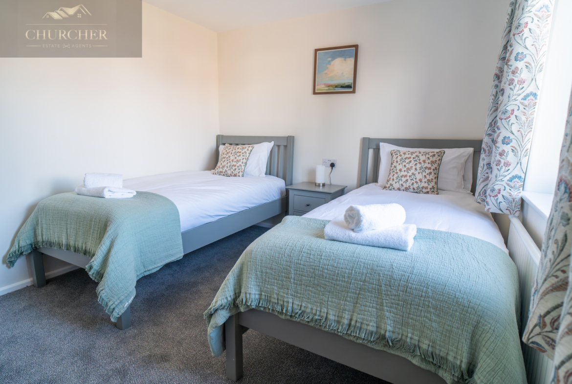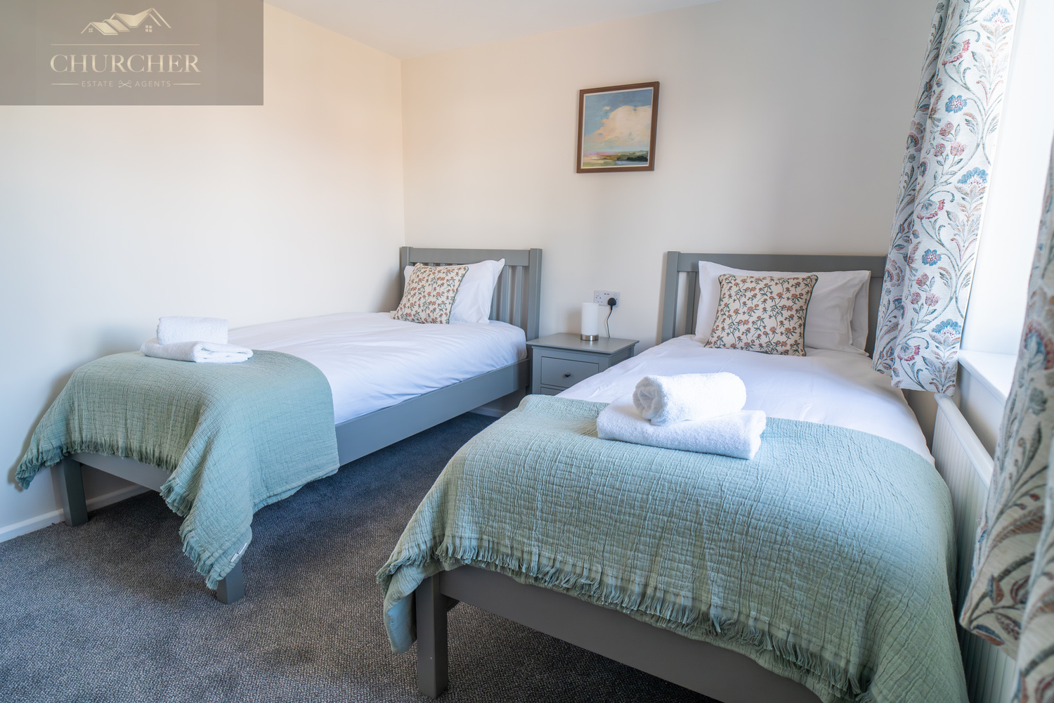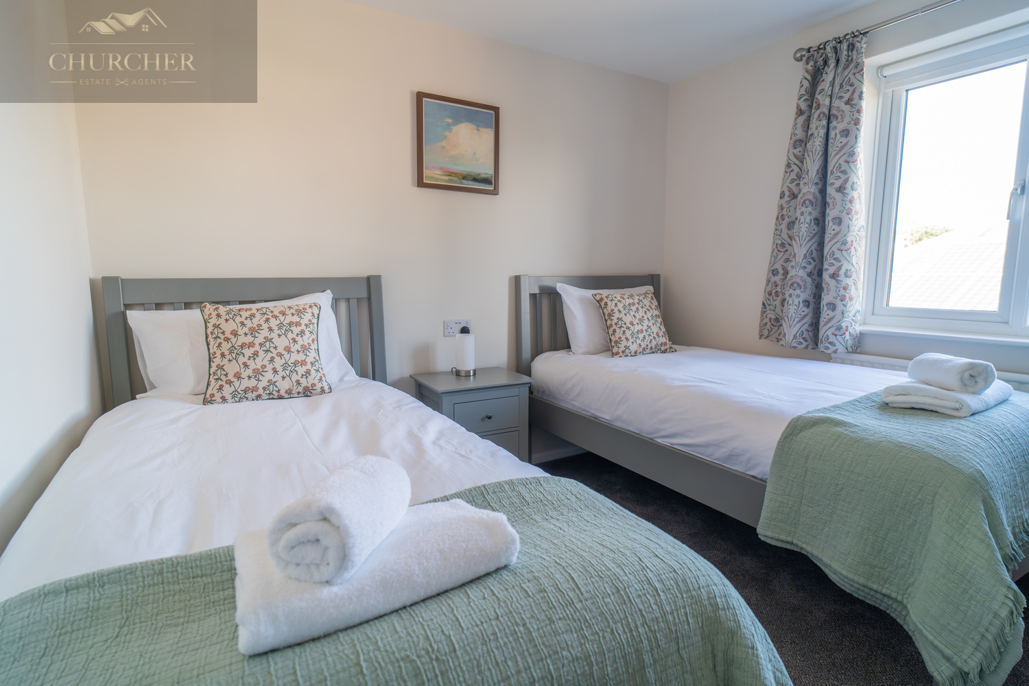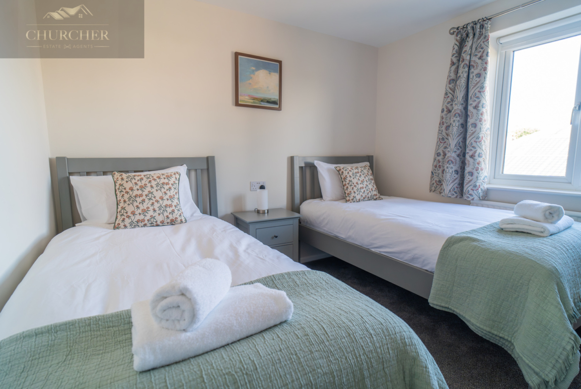 The second bedroom is equally inviting, featuring two comfortable single beds dressed in fresh coastal tones, making it perfect for friends, visiting colleagues, or younger guests. The main bathroom on this level mirrors the same standard of luxury, with modern grey tiling, a spacious walk-in shower, and high-quality fixtures throughout.