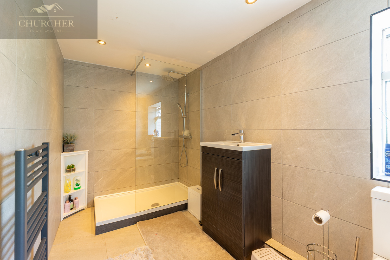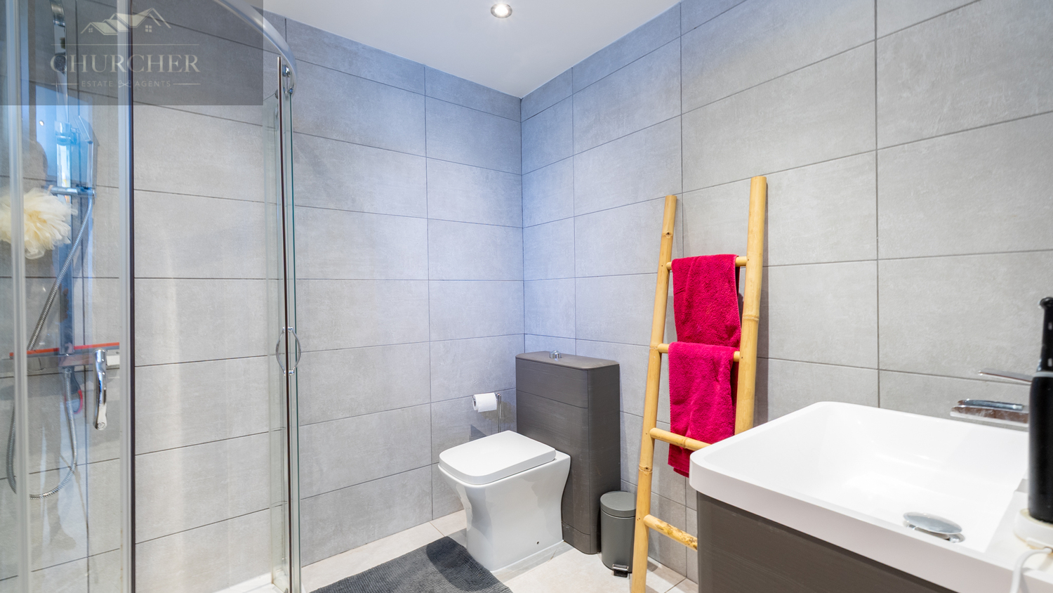 The suite is completed by a beautifully appointed en-suite shower room, finished in sleek, large-format grey tiling from floor to ceiling for a contemporary, spa-like feel. A curved glass corner shower enclosure with chrome fittings provides a refreshing space to unwind, while the dark wood-effect vanity unit with integrated basin and soft-close drawers adds both storage and sophistication. A matching concealed-cistern WC and stylish ladder-style heated towel rail complete this well-appointed space, blending design and functionality seamlessly.