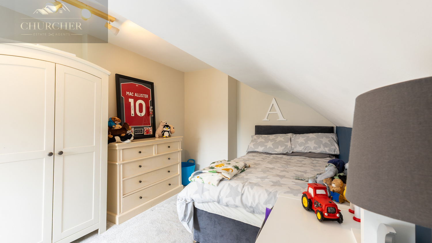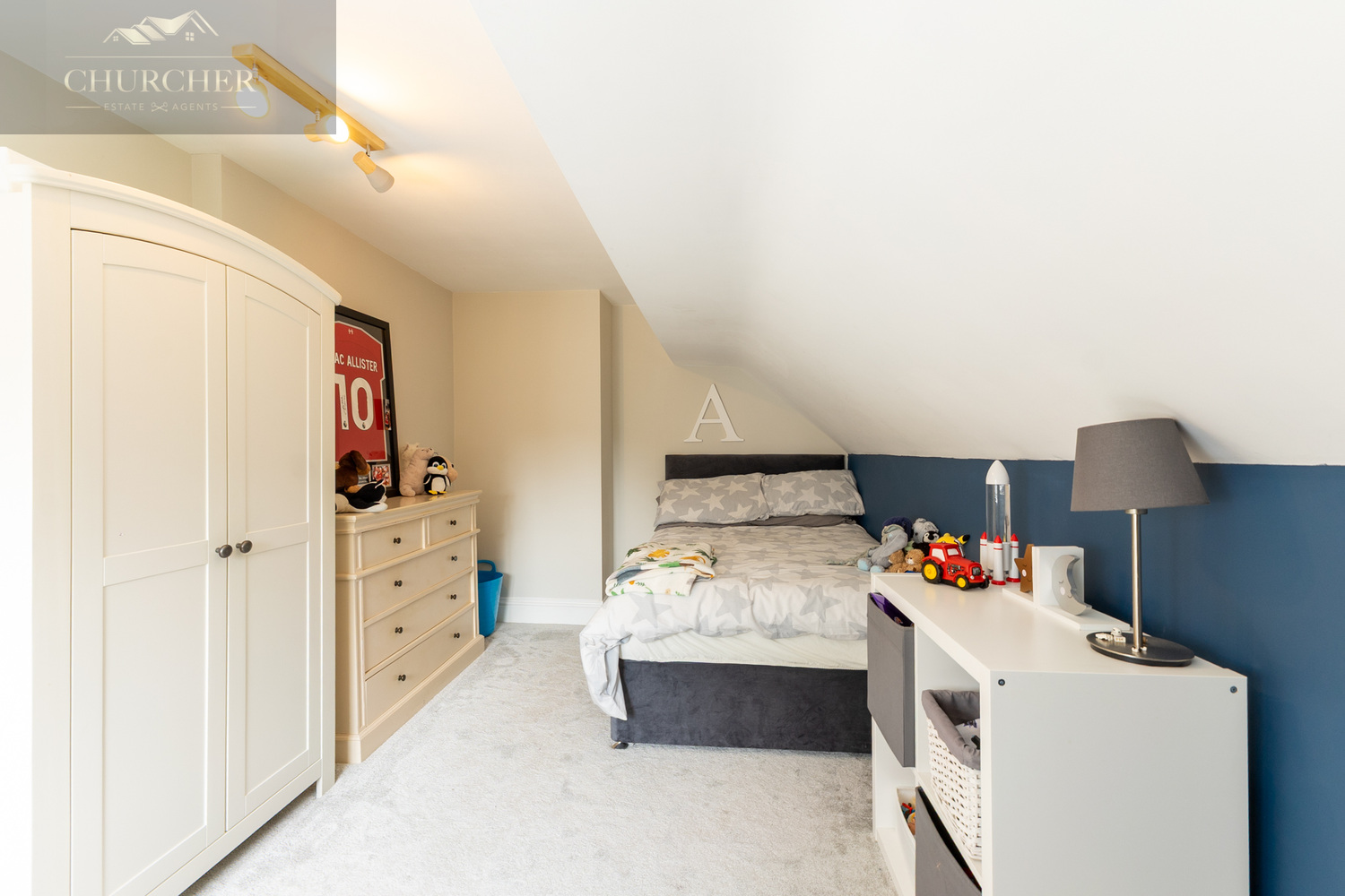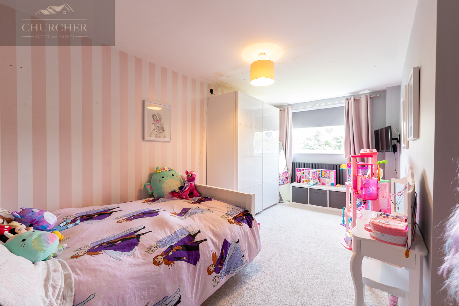 The remaining three bedrooms each offer their own charm and functionality. One is ideal for a double guest room with elegant décor, another currently serves as a delightful children’s room adorned with soft pink striped wallpaper and abundant space for toys and storage, while the fourth bedroom provides a bright and adaptable space, perfect for a growing child or home office setup.