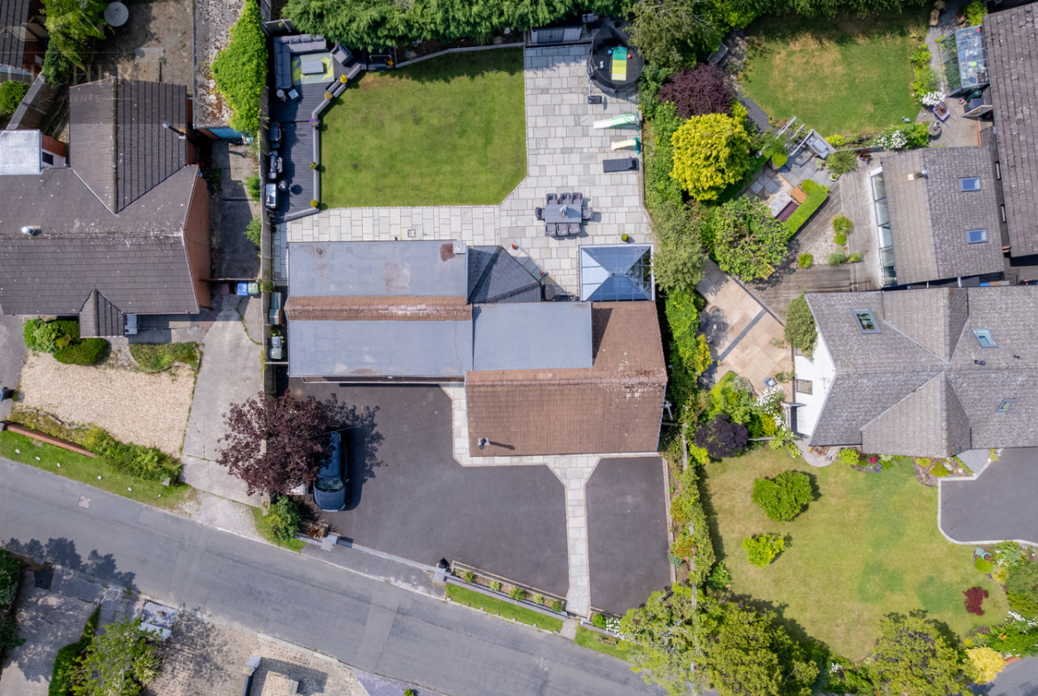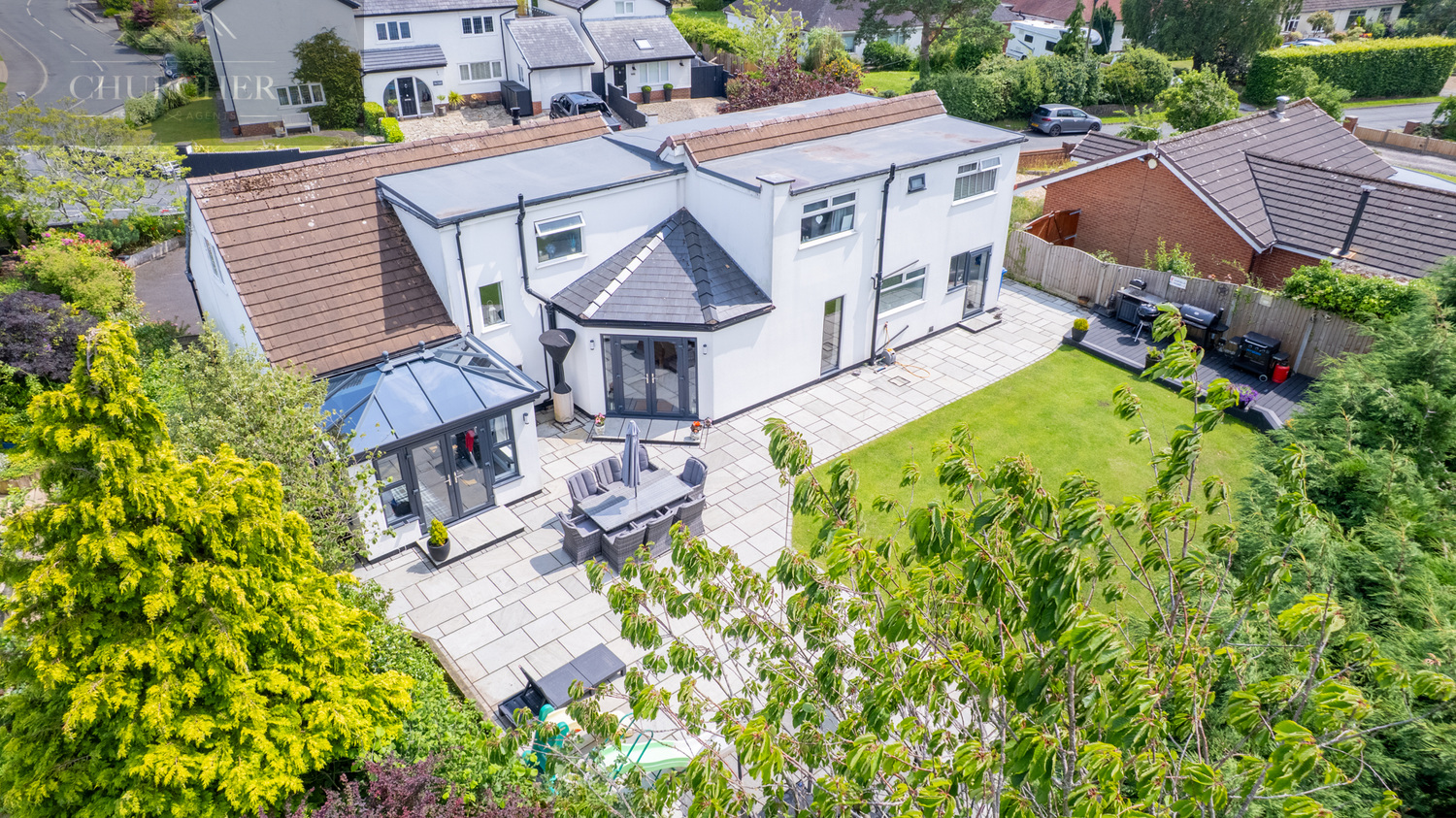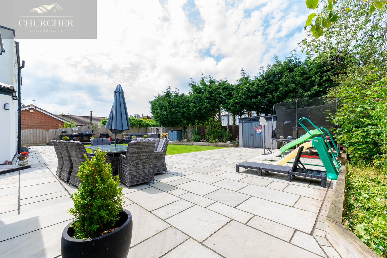 To the rear, the property continues to impress with a beautifully landscaped and fully enclosed garden, designed for both family enjoyment and entertaining. A large stone patio wraps around the rear elevation, offering multiple zones for outdoor dining, seating, and relaxation. Whether you’re hosting summer barbecues, enjoying morning coffee, or unwinding in the evening sun, this space caters to all occasions.