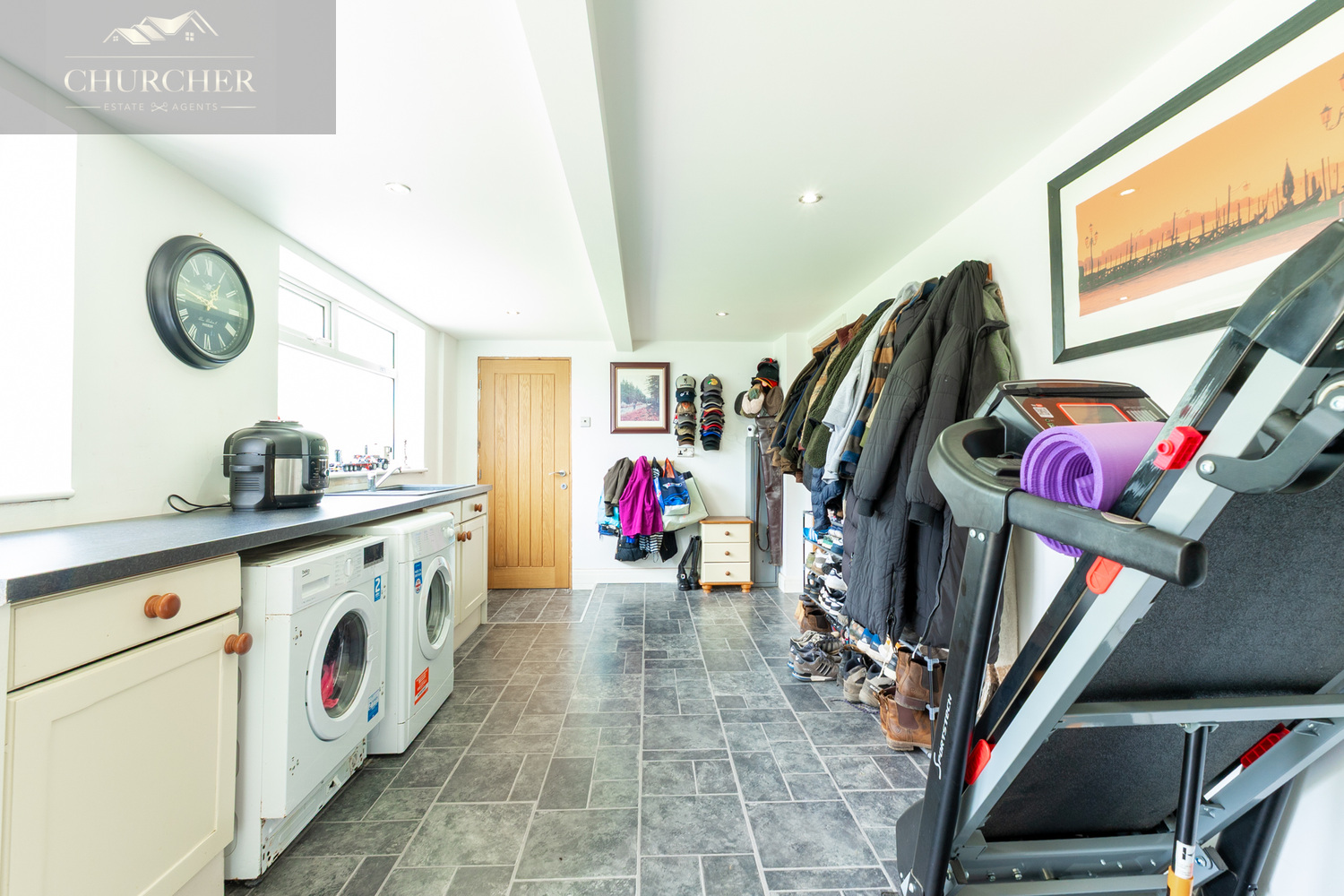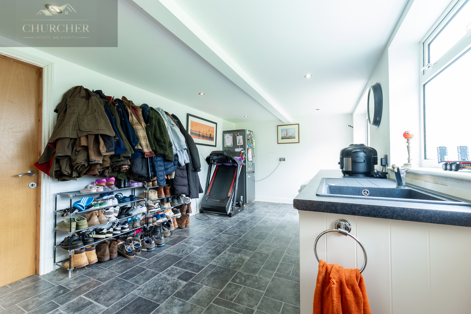 To the rear of the property lies a substantial utility/boot room that spans the length of the home. Fitted with ample storage units, worktops, sink, laundry appliances and external access, this room is perfectly suited to busy family life and offers excellent space for outdoor gear, pets, or gym equipment.
